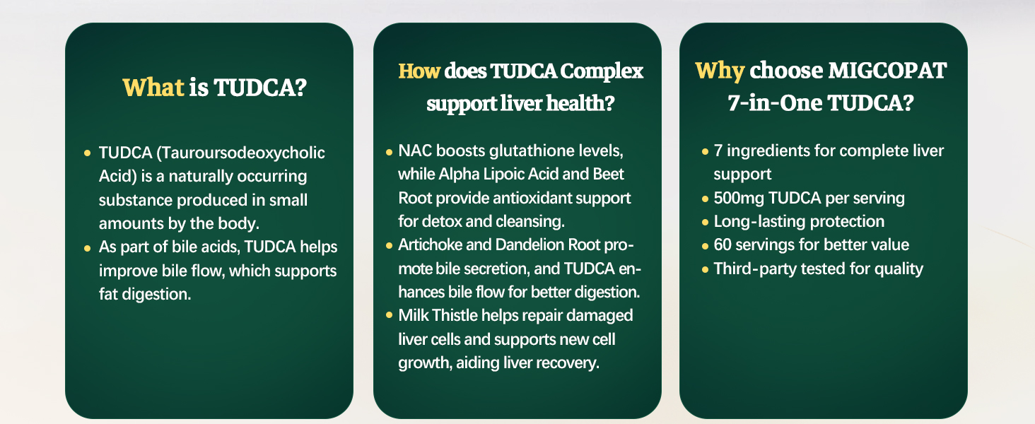 • دعم كامل للكبد في 3 خطوات: يوفر مكمل دعم الكبد Migcopat TUDCA دعمًا كاملاً لصحة الكبد في ثلاث خطوات بسيطة. الخطوة الأولى تساعد في التخلص من سموم الكبد وتطهيره، مما يساعد على إزالة الفضلات والشوائب. الخطوة الثانية تعزز تدفق الصفراء، مما يدعم هضم الدهون والتخلص من الفضلات. الخطوة الثالثة تحمي خلايا الكبد وتعزز دفاع الكبد بشكل عام. تم تركيبه علميًا لحماية صحة الكبد.