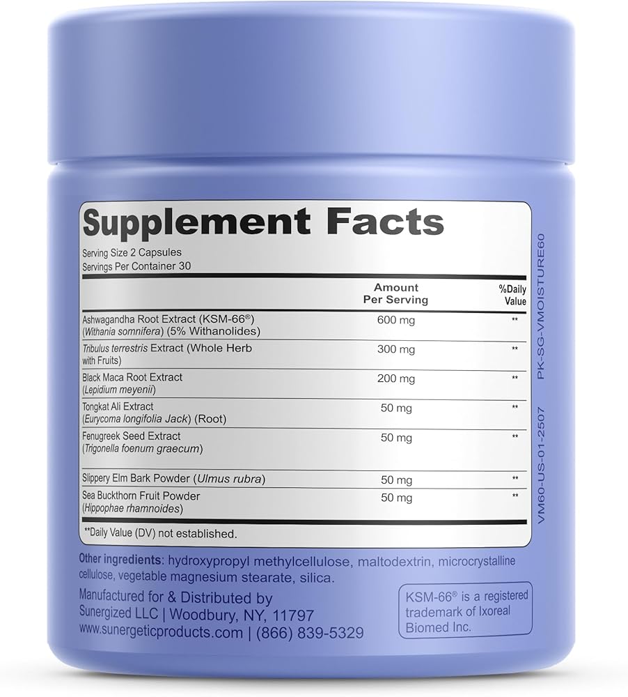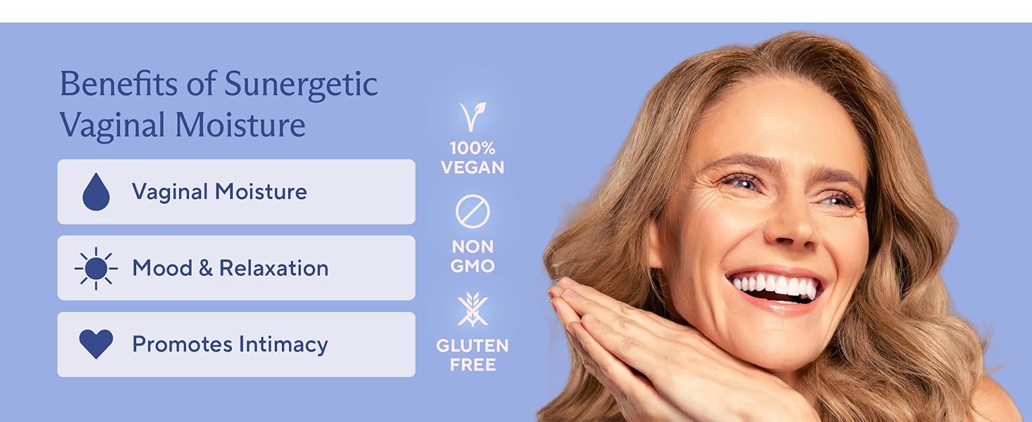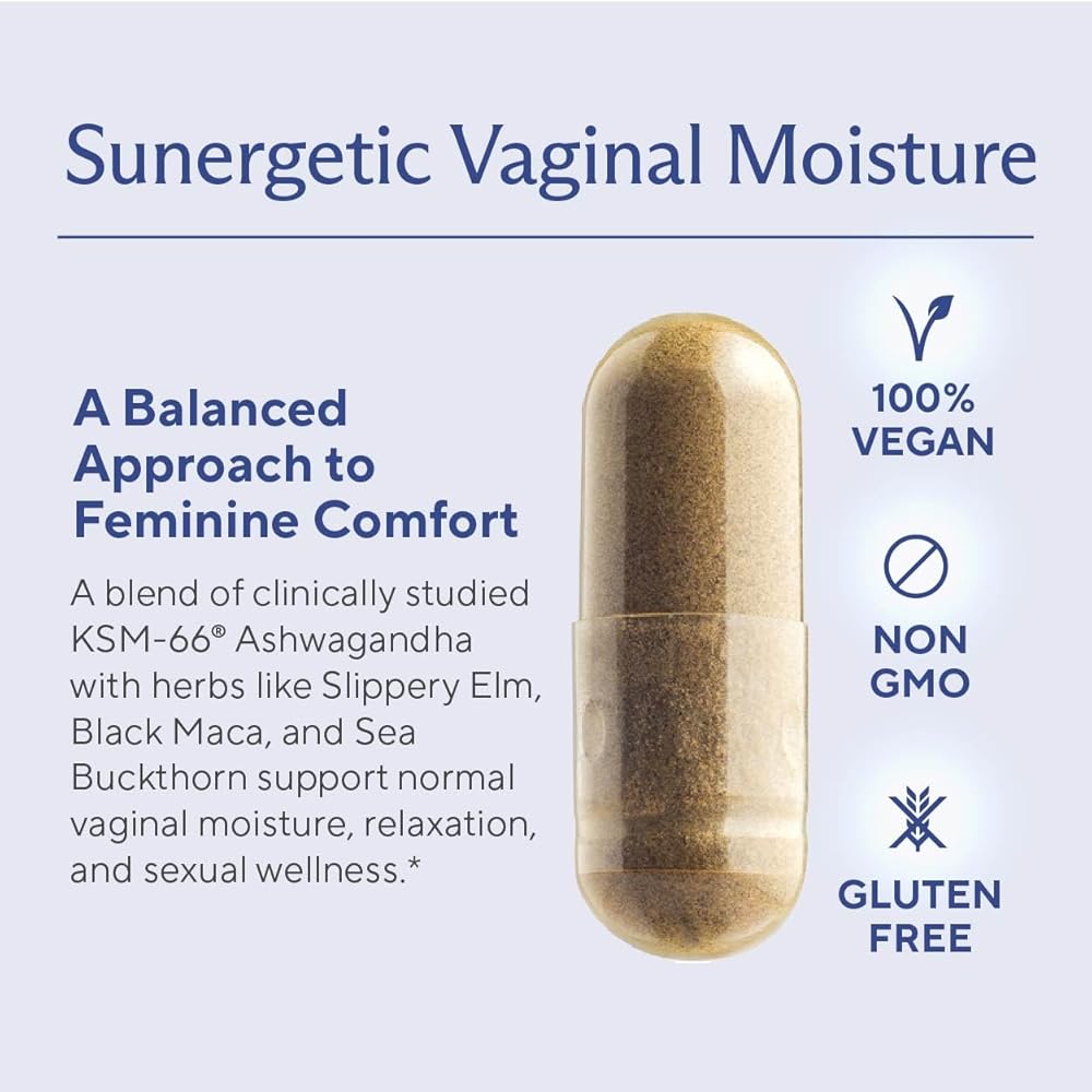 مكمل قوي للرطوبة المهبلية: تم تركيب مكمل الرطوبة المهبلية من Sunergetic للمساعدة في تخفيف جفاف المهبل وتعزيز الرطوبة المهبلية الطبيعية ودعم الوظيفة الجنسية والمساعدة في تقليل الإجهاد العرضي. نحن نستخدم KSM 66 Ashwagandha الذي تمت دراسته سريريًا، والذي أظهر أنه يساعد في تعزيز المزاج الصحي والاسترخاء وزيادة الإثارة والتشحيم. يمكن لمكملات الرطوبة والمزاج المهبلية أن تساعد النساء في التعامل مع صعوبات جفاف المهبل وانخفاض الحالة المزاجية. جربي كبسولاتنا المرطبة للمهبل اليوم لتساعدك على الشعور بالفرق ودعم العلاقة الحميمة.