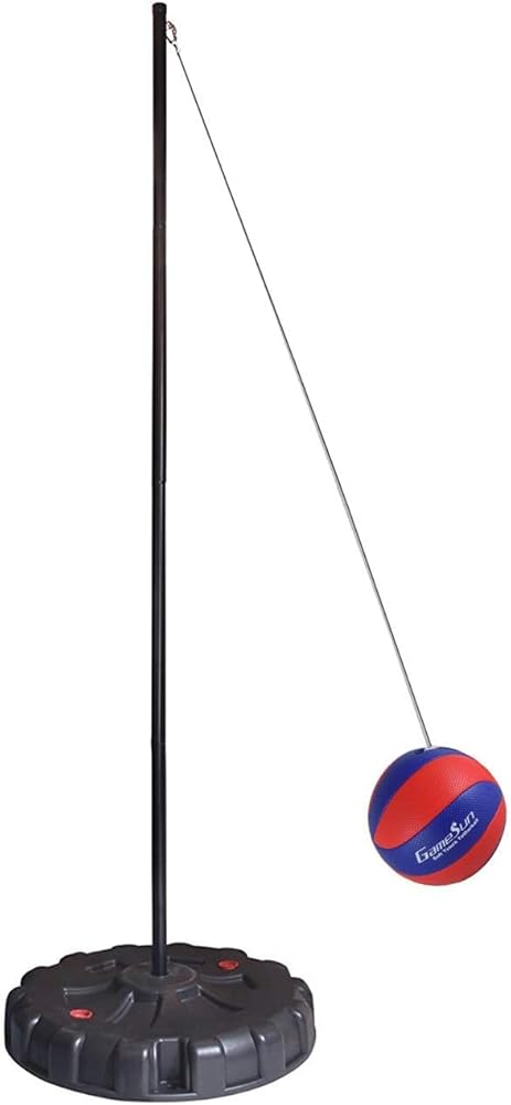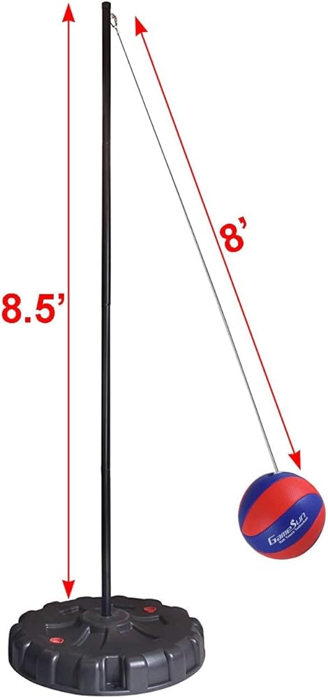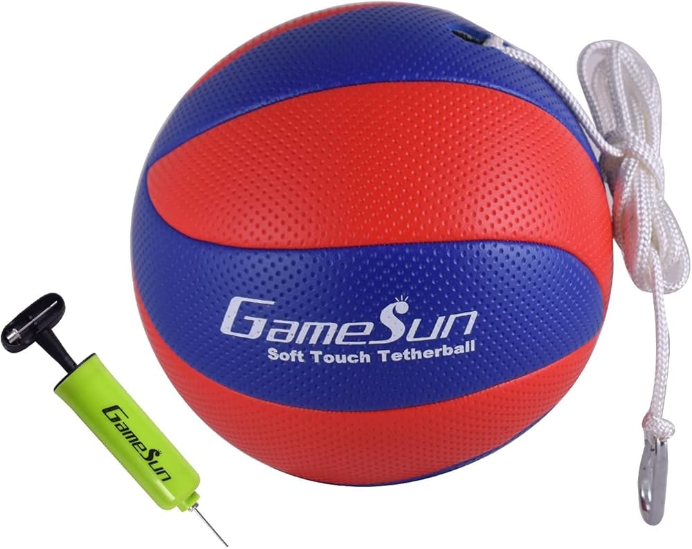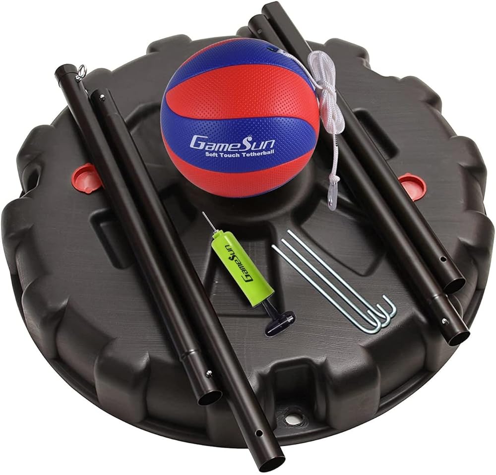 • ♥ Set come with (1) HDPE plastic base, (1) deluxe red/blue machine-sewn soft tetherball with pump (needle included), (1) nylon rope, (1) carabineer, (4) metal poles and (3) steel stakes.