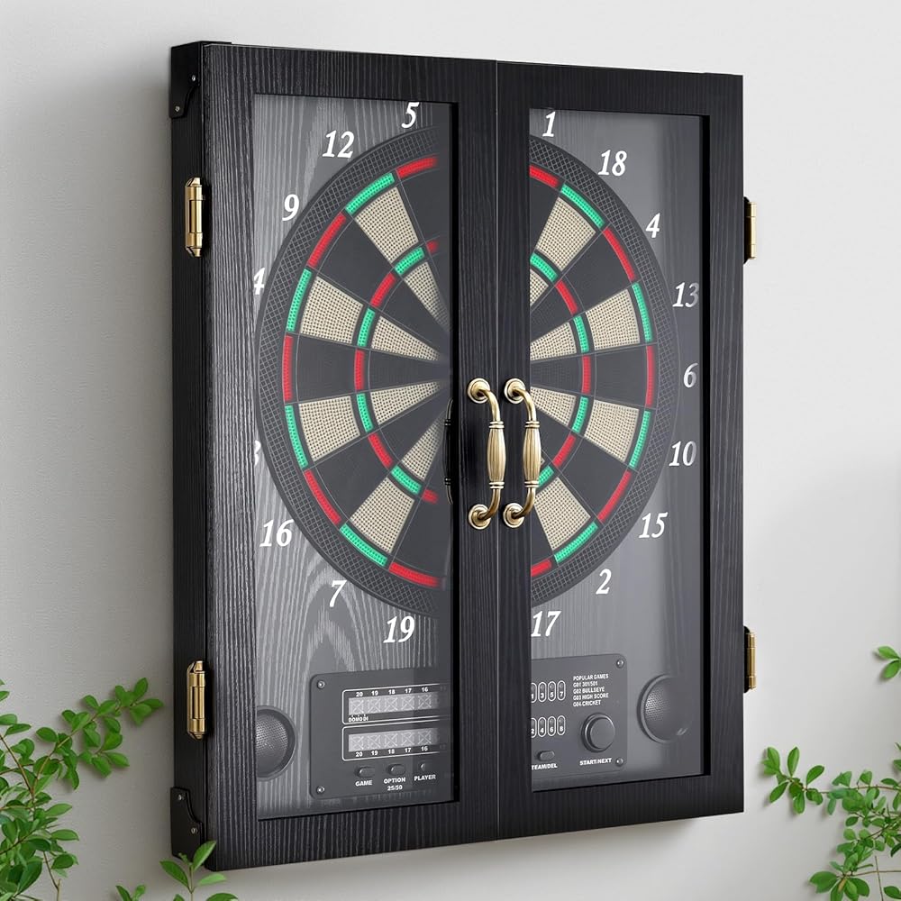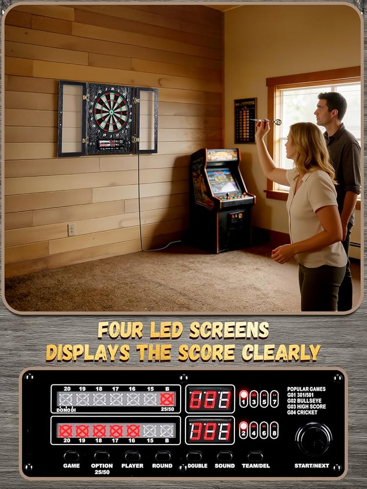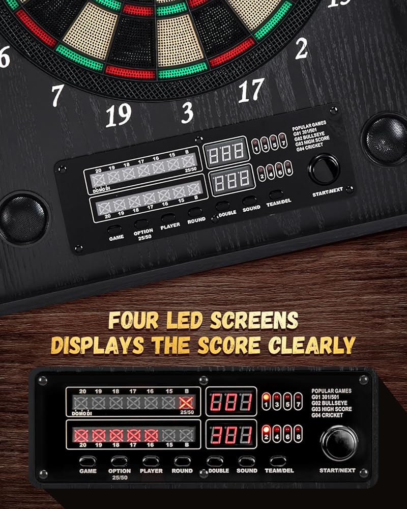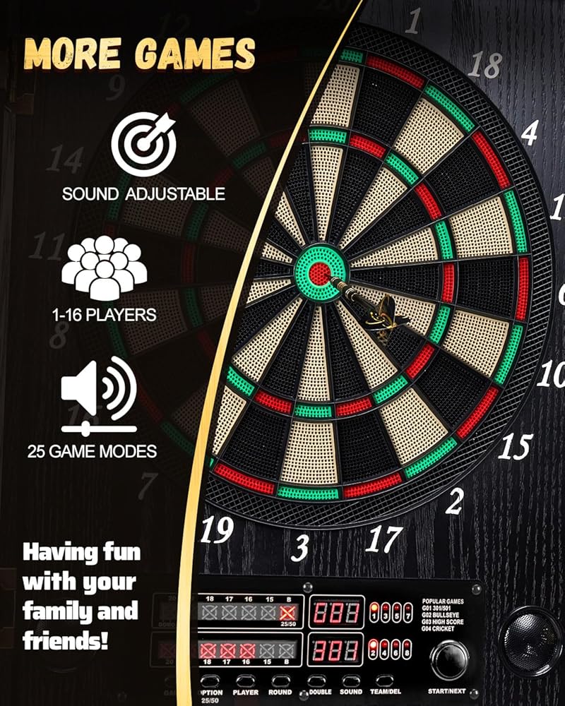 [25 لعبة لما يصل إلى 8 لاعبين] مجموعة خزانة لوحة رمي السهام الكهربائية مجهزة بنظام تسجيل إلكتروني متطور، مما يعزز تجربة اللعب الخاصة بك، مما يسمح لما يصل إلى 8 لاعبين بالانضمام في أي مناسبة، بدءًا من حفلات الانتقال لمنزل جديد وأعياد الميلاد إلى العروض الترويجية واحتفالات التقاعد.