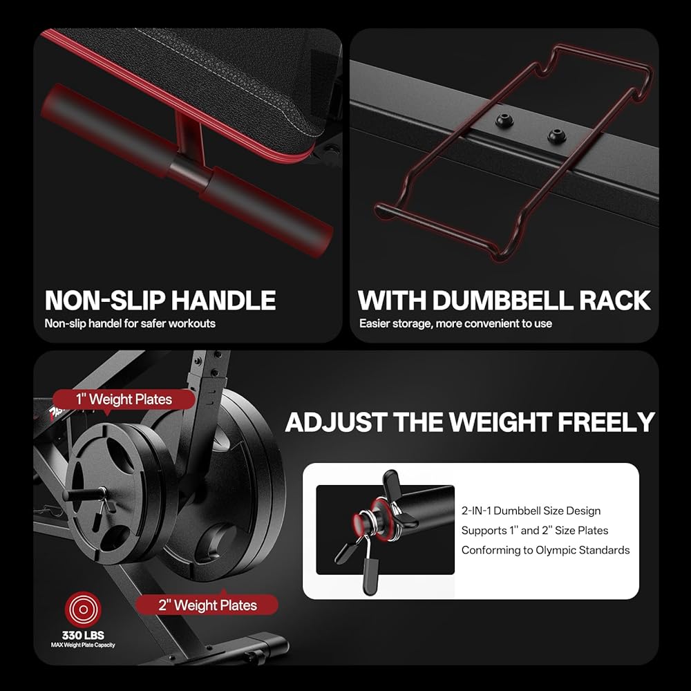 • Sturdy Frame & Stable Structure: Constructed with thickened, high-strength steel, this workout bench with leg extension features a reinforced triangular frame design for exceptional stability and durability. As a high weight capacity leg press, it supports up to 1300 lbs and accommodates users from 64" to 79" height, provides safe and reliable performance for daily workouts, strength training, and high-intensity home gym use.