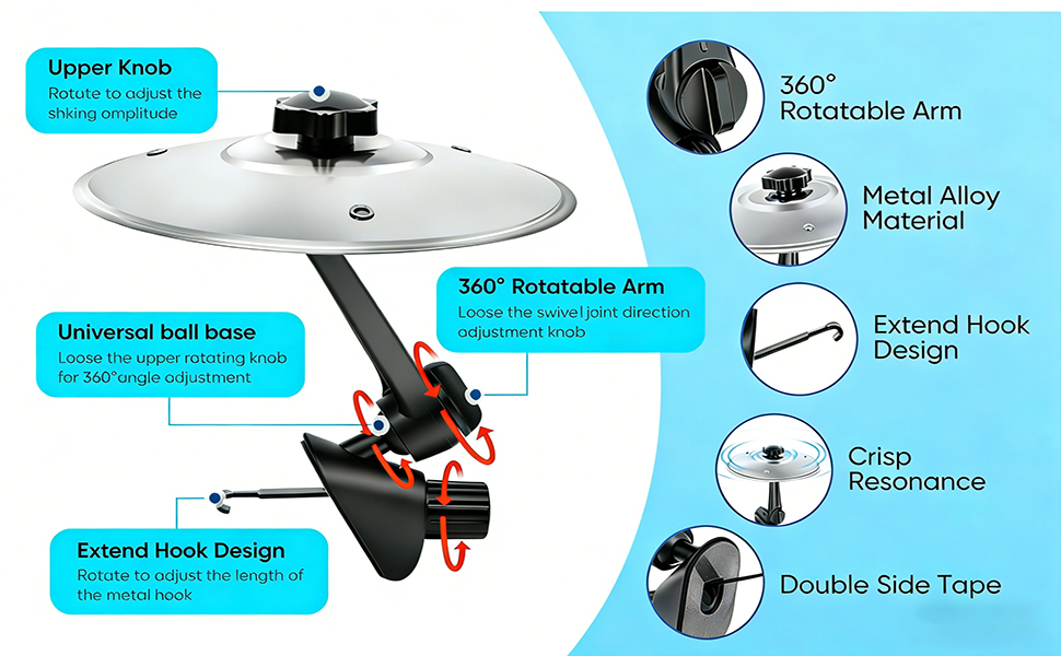 2. قم بالتثبيت بسهولة في ثوانٍ، قم بتمرير صنج السيارة هذا في مكانه - لا حاجة لأي أدوات أو مواد لاصقة! يتم قفل ذراع الشد القابل للتعديل بشكل آمن على فتحات أفقية أو رأسية (أو حتى لوحات أجهزة القياس)، مما يبقيه ثابتًا أثناء الطبول المتحمسة. لا يوجد انزلاق - مجرد متعة إيقاعية خالصة.