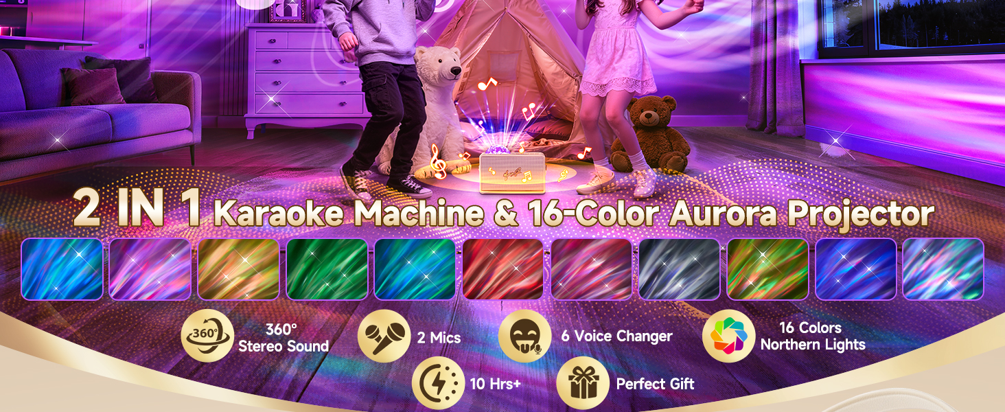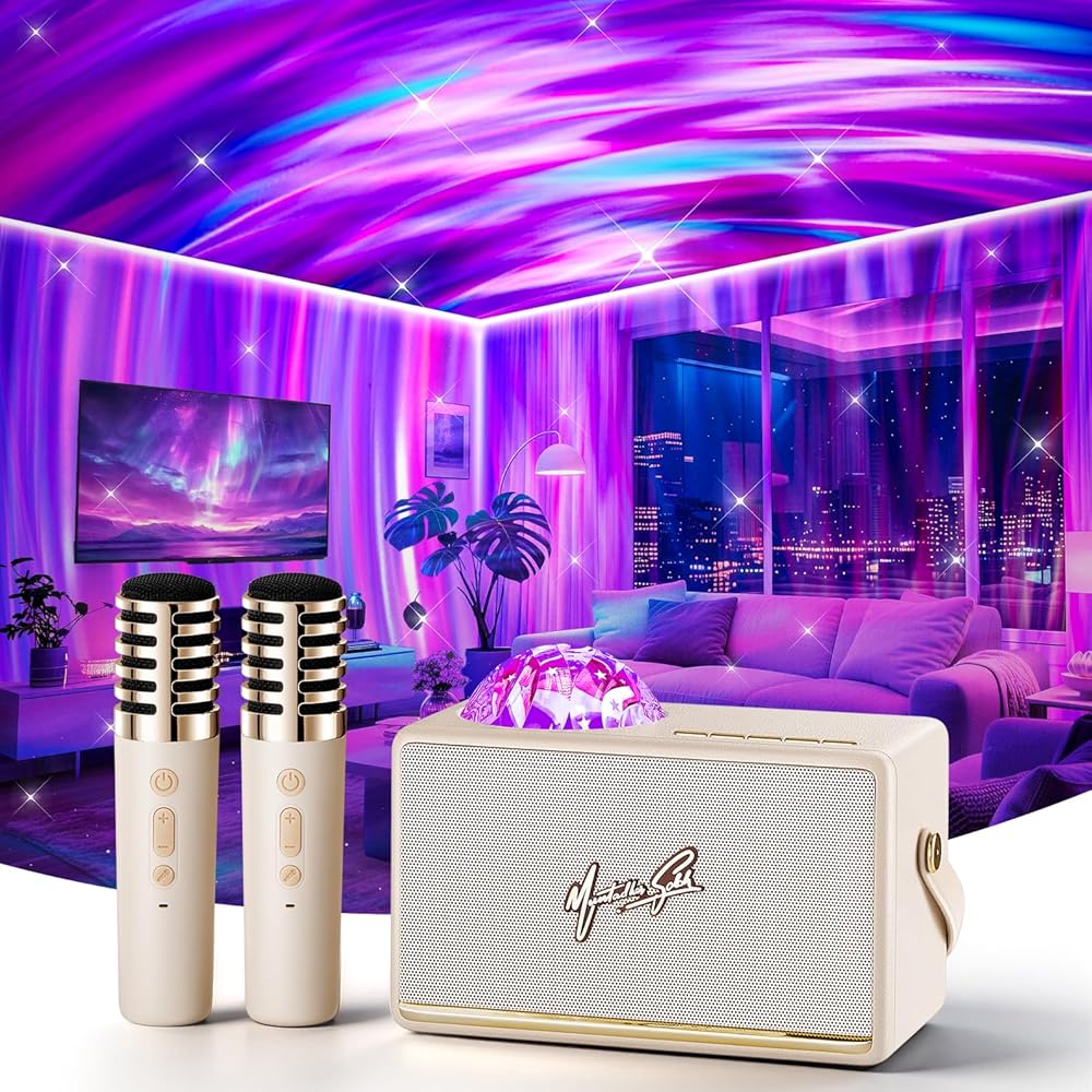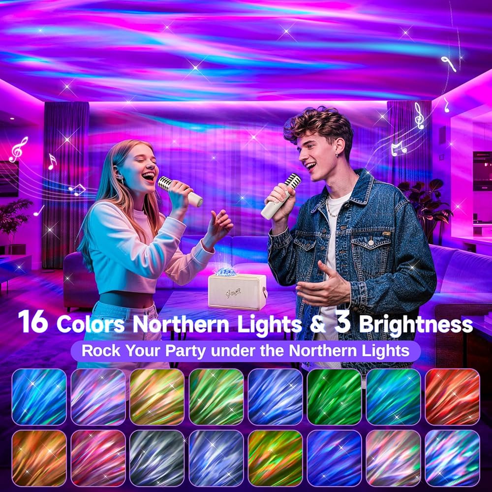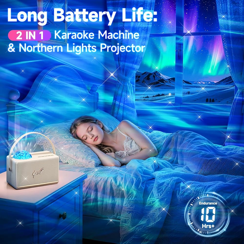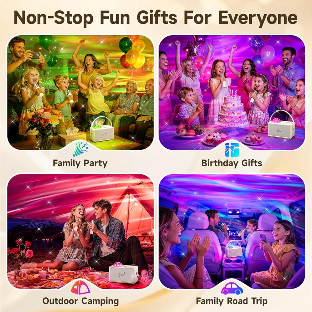 آلة كاريوكي للأطفال والبالغين في سن المراهقة مع جهاز عرض الأضواء الشمالية، 16 لونًا 2 ميكروفون كاريوكي للأطفال آلة كاريوكي صغيرة ضوء أورورا، 6 مغير صوت هدايا للفتيات المراهقات أشياء عصرية