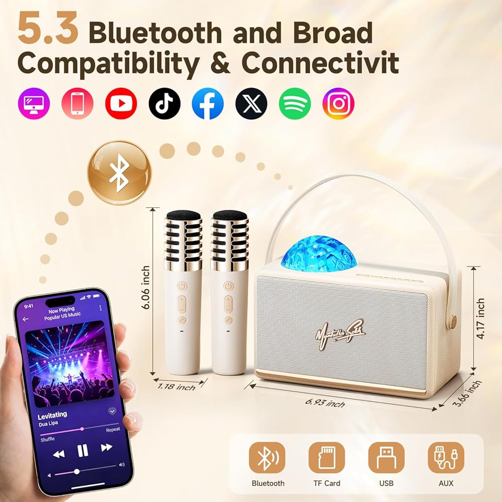 👍【جهاز كاريوكي 4 في 1 مطور للأطفال البالغين وجهاز عرض الأضواء الشمالية】تم ترقية جهاز الكاريوكي للأطفال إلى إصدار 4 في 1 من جهاز كاريوكي للأطفال، وجهاز عرض الأضواء الشمالية، ومكبر صوت بلوتوث هاي فاي وإضاءة ليلية، مما يساعد الأطفال على تحقيق أحلامهم الغنائية، واسترخاء الجسم والعقل، وتوجيههم إلى حلم جميل. يتميز جهاز عرض ضوء الشفق بمزيد من أوضاع الإضاءة: 49 وضع إضاءة ونطاق أوسع لتغطية السقف بالكامل. ويومض جهاز عرض أورورا، المجهز بميكروفونين، مع الموسيقى، مما يخلق جوًا احتفاليًا. من خلال الجمع بين آلة كاريوكي صغيرة وجهاز عرض أورورا في جهاز واحد، يتيح لك الاستمتاع بمجموعة متنوعة من التجارب المرئية وتجارب الكاريوكي.