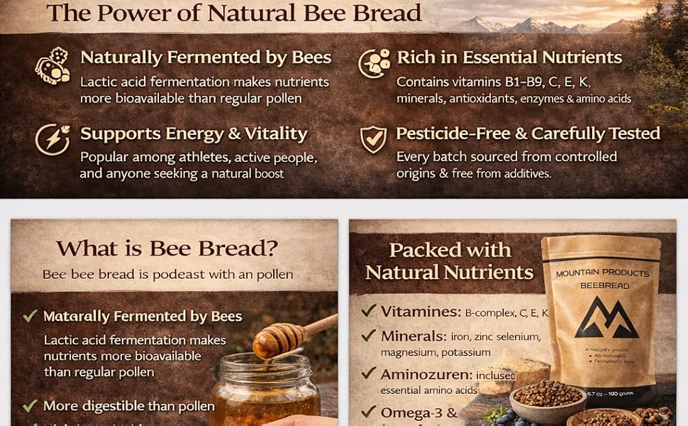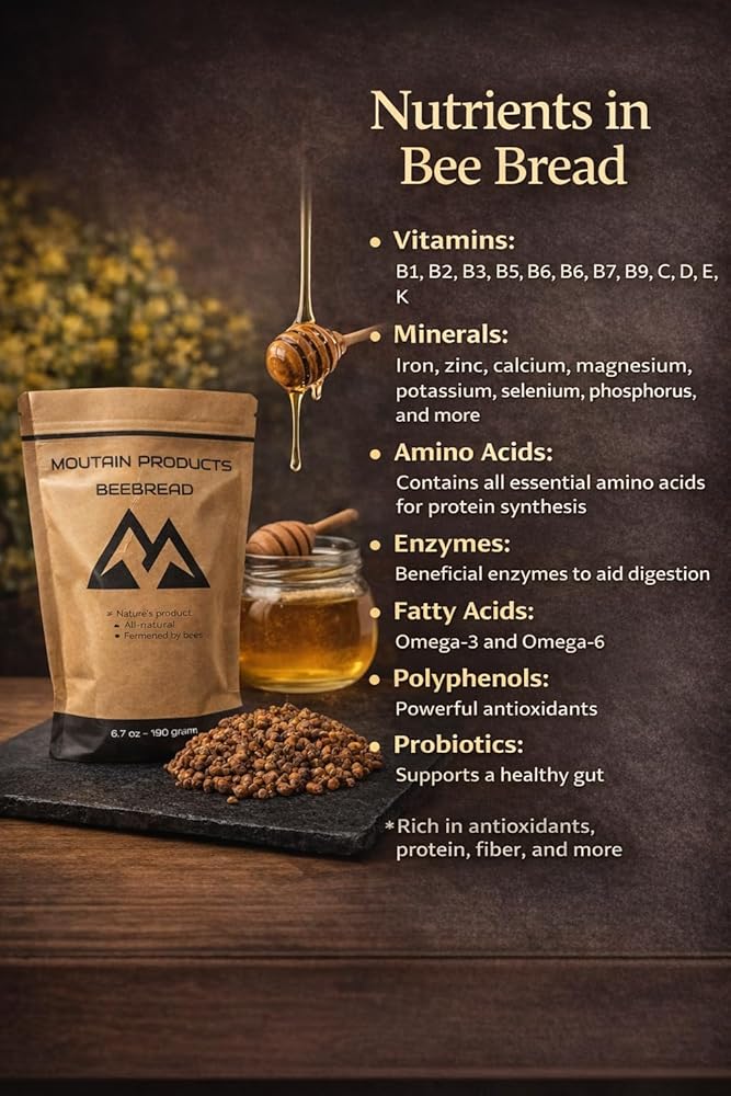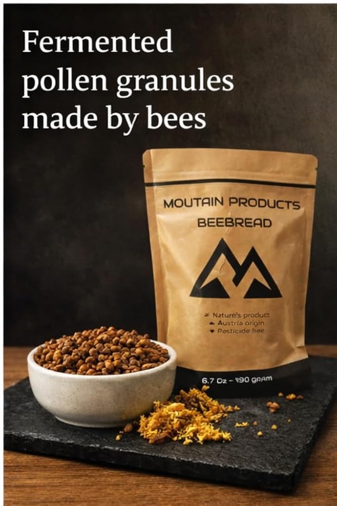 منتجات الجبال - خبز النحل 6.7 أونصة (190 جرام) - نكهة طبيعية - عضوي - حبوب لقاح النحل المخمرة بشكل طبيعي - برجا
