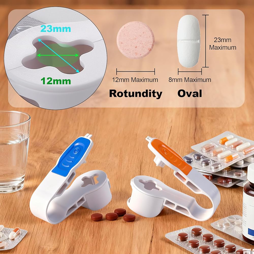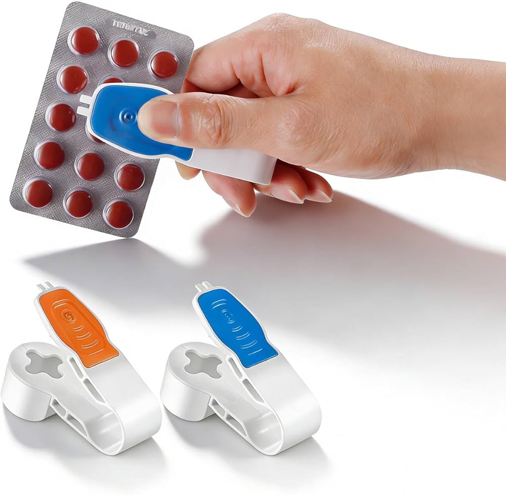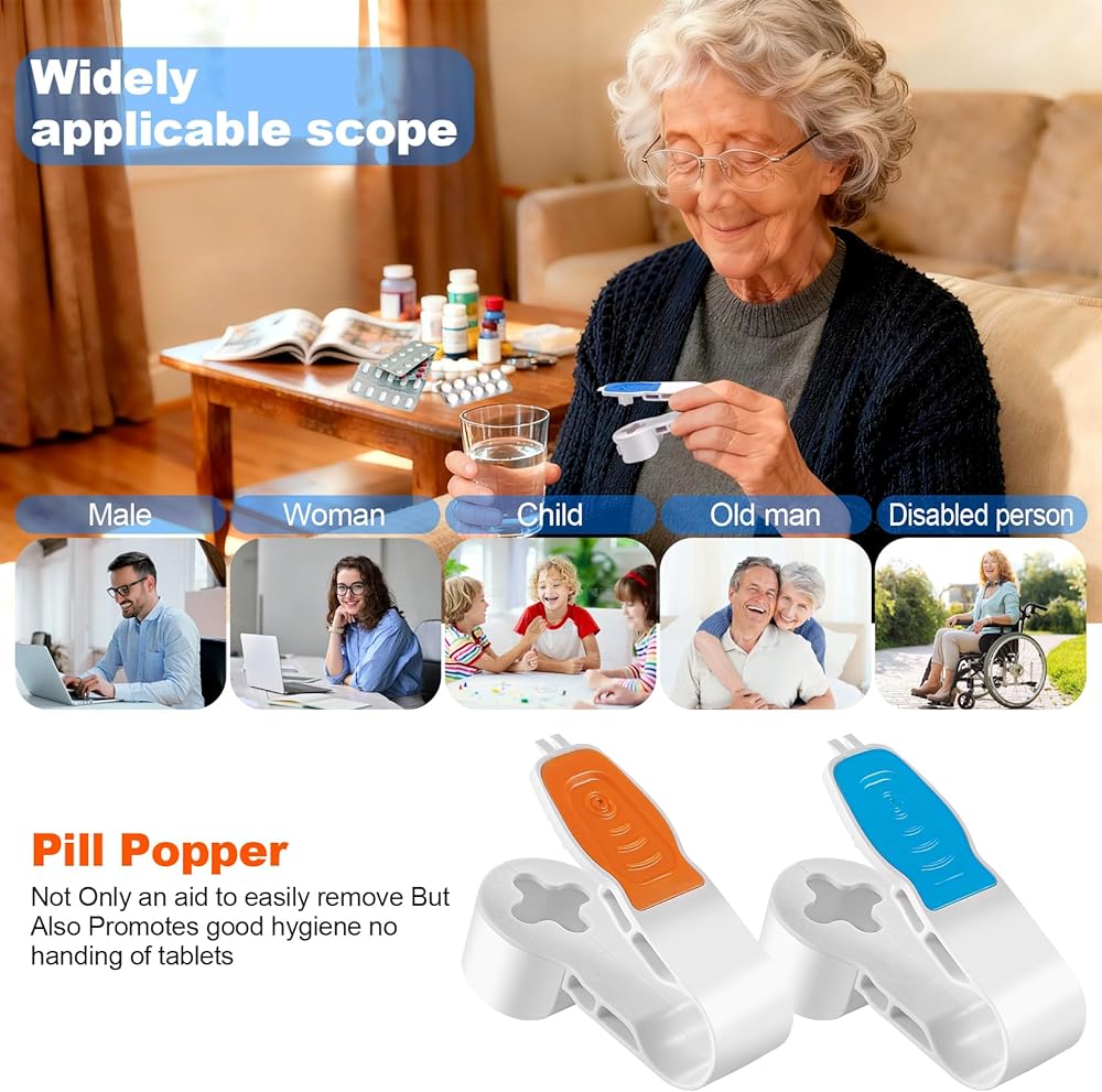 AK-SIHP This portable pill Popper makes managing your daily medication routine simpler and more convenient than ever before.The innovative 2-pack design uses an ergonomic pressing mechanism to effortlessly remove pills from blister packs without the need for traditional methods.Each pill Popper includes a dual-tooth feature that easily pierces the foil packaging, allowing you to press pills directly into the built-in storage compartment below.The clever design means you can dispense medication in one smooth motion and then access the tablets through the sliding compartment door.Perfect for those with limited hand strength, arthritis, or long nails, this handy tool takes the frustration out of wrestling with stubborn blister packs.The compact and lightweight construction makes it ideal for travel and easily fits in a pocket or medicine cabinet.Available in two vibrant colors, these Pill Poppers combine function with style.Whether you're at home or on the road, this practical accessory ensures you get your medication quickly and cleanly without pills flying over the counter or getting lost.