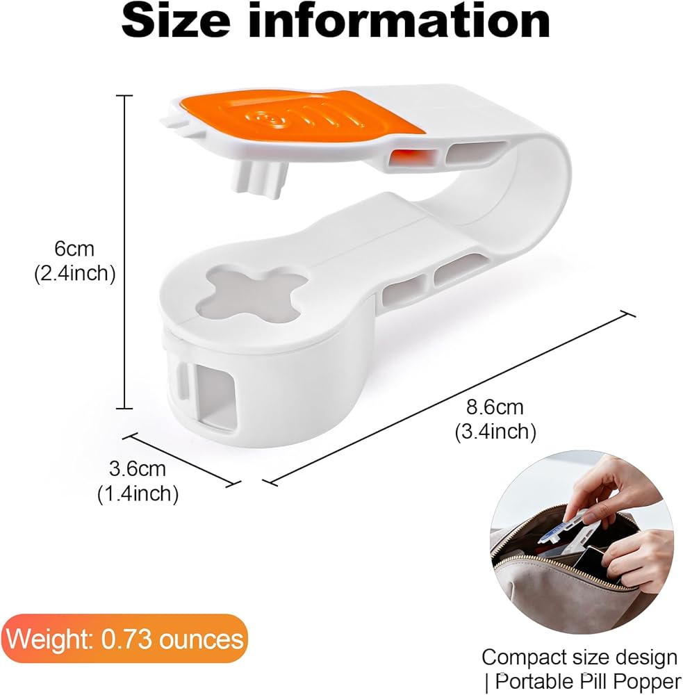 VALUE PACK: Includes 2 portable pill poppers in blue and orange colors for multiple locations or backup use A tool for assisting in the removal of pills
