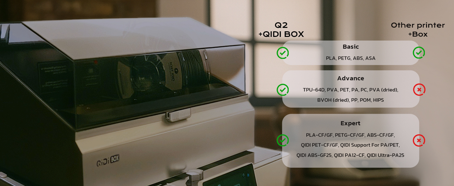• [فتح متعدد الألوان والمواد المتعددة] يتيح Q2 مع QIDI BOX طباعة ثلاثية الأبعاد لما يصل إلى 16 لونًا متعدد المواد باستخدام تقنية الطباعة الجافة أثناء الطباعة، مما يحافظ على جفاف الخيوط من أجل قذف مستقر وأسطح ناعمة. يدعم مركبات PLA وABS وPETG وTPU وPA وPC وألياف الكربون/الزجاج للحصول على نماذج أولية قوية ودقيقة ونماذج نابضة بالحياة.