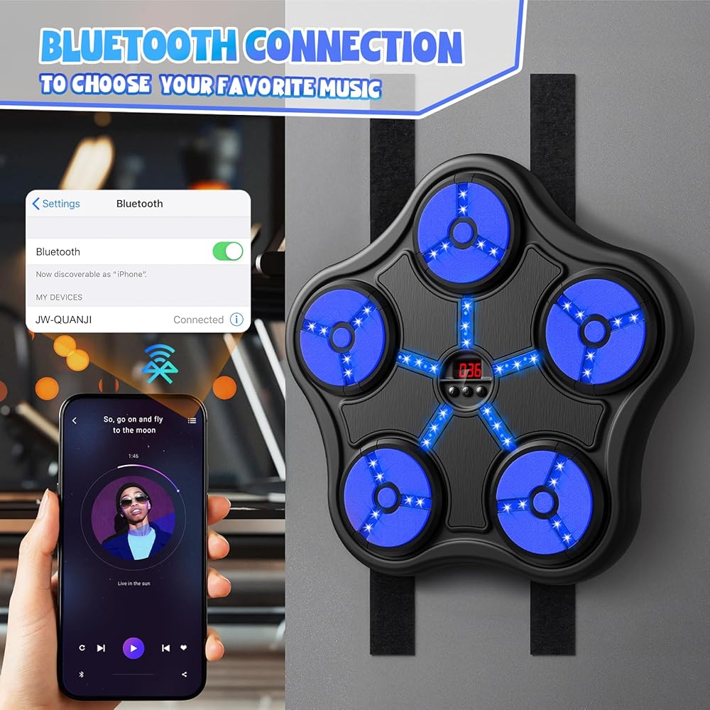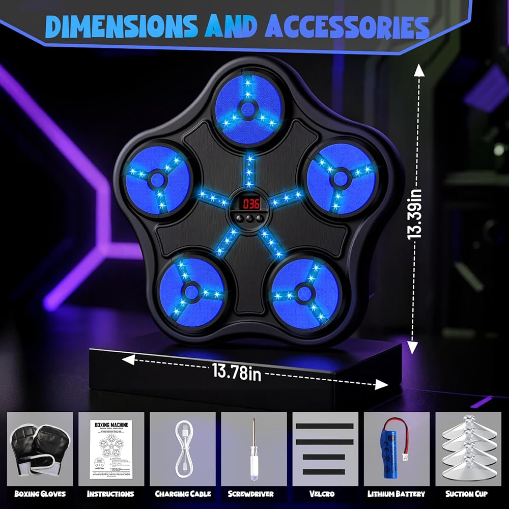 آلة الملاكمة الذكية: اختر الموسيقى المفضلة لديك من خلال اتصال البلوتوث. بمساعدة توجيه ضوء LED، يمكن للأطفال متابعة إيقاع الموسيقى لضرب الأهداف، وتحسين قدرتهم على التفاعل والتنسيق، وإنشاء لياقة بدنية بقدرة متفجرة وخفة حركة.