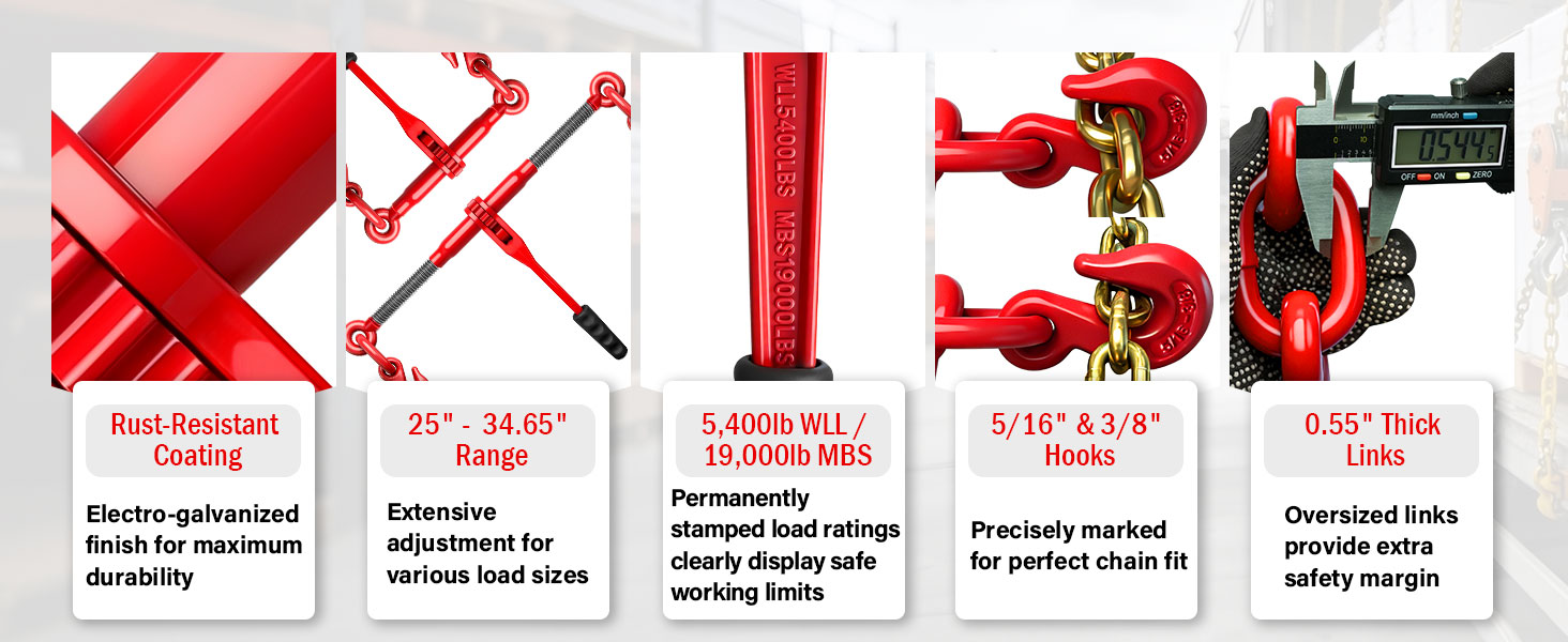 • 【يناسب سلسلة 5/16 بوصة و3/8 بوصة】 - مجموعة واحدة تغطي مقاسين قياسيين. تم تصميم خطافات الإمساك بدقة لتناسب سلاسل النقل مقاس 5/16 بوصة و3/8 بوصة بشكل آمن، مما يوفر اتصالاً متعدد الاستخدامات وغير قابل للانزلاق للشاحنات والمقطورات والمعدات