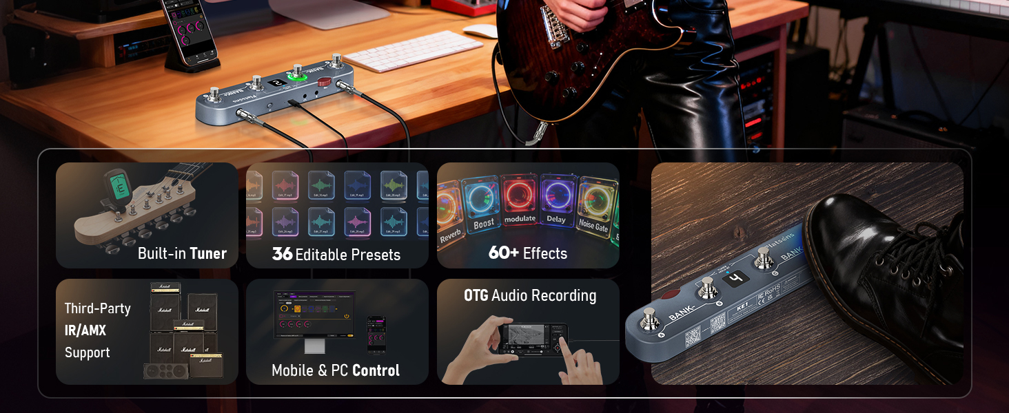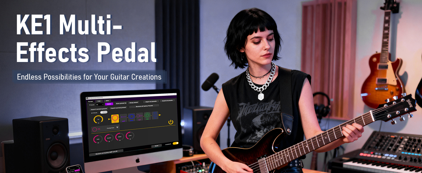 دواسة متعددة التأثيرات من الجيل التالي: يدمج KE1 61 مؤثرًا عالي الجودة عبر 6 وحدات متعددة الاستخدامات: FX، وAMP، والتعديل، والتأخير، والتردد، وIR CAB. يشتمل قسم FX الخاص به على Noise Gate، وBoost، وCompressor، ويمكن دمجهما بالكامل مع AMP وIR CAB لكل شيء بدءًا من عمليات التنظيف الأصلية وحتى النغمات عالية الكسب. بالإضافة إلى ذلك، مع التجاوز الحقيقي والموالف المدمج، يمكنك الحصول على نغمة نقية وضبط دقيق في وحدة واحدة مدمجة