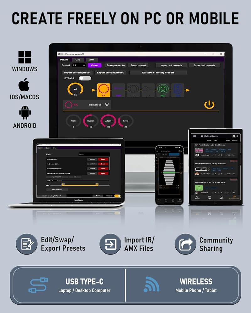 التحكم في التطبيق وتسجيل USB OTG: قم بتبديل النغمات وضبط المعلمات بسهولة عبر التطبيق أو برنامج الكمبيوتر مع واجهة بديهية - لا حاجة إلى النقر المستمر على الدواسة. يدعم تسجيل USB OTG hi-fi، بالإضافة إلى الاسترجاع ومسار الدعم اللاسلكي ومراقبة سماعة الرأس. قم بتسجيل مسارات متعددة أو مزجها على مسار واحد، وهو مثالي للتدريب والبث المباشر والتسجيل المنزلي