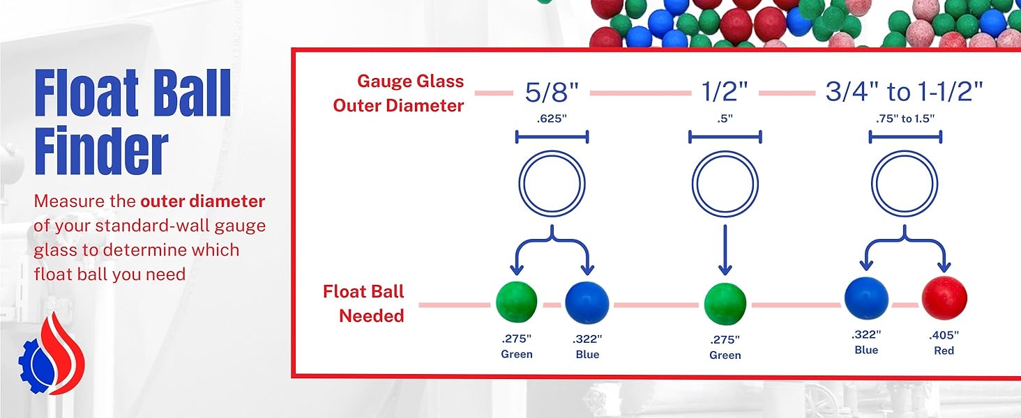 - هذا الحجم القياسي (الكرة العائمة بقطر .405 بوصة) مصنوع فقط لأحجام زجاج الجدران القياسية ذات الضغط العالي التالية: 3/4 بوصة OD، 1 بوصة OD، 1-1/4 بوصة OD، 7/8 بوصة OD، 1-1/8 بوصة OD، و1-1/2 بوصة OD.