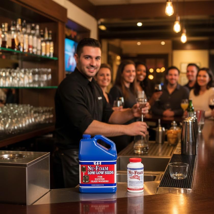 DUAL PRODUCT BUNDLE: Complete glassware cleaning solution including Nu-Foam Low-Low Suds detergent and Nu-Foam sanitizing tablets with Rinse-Aid