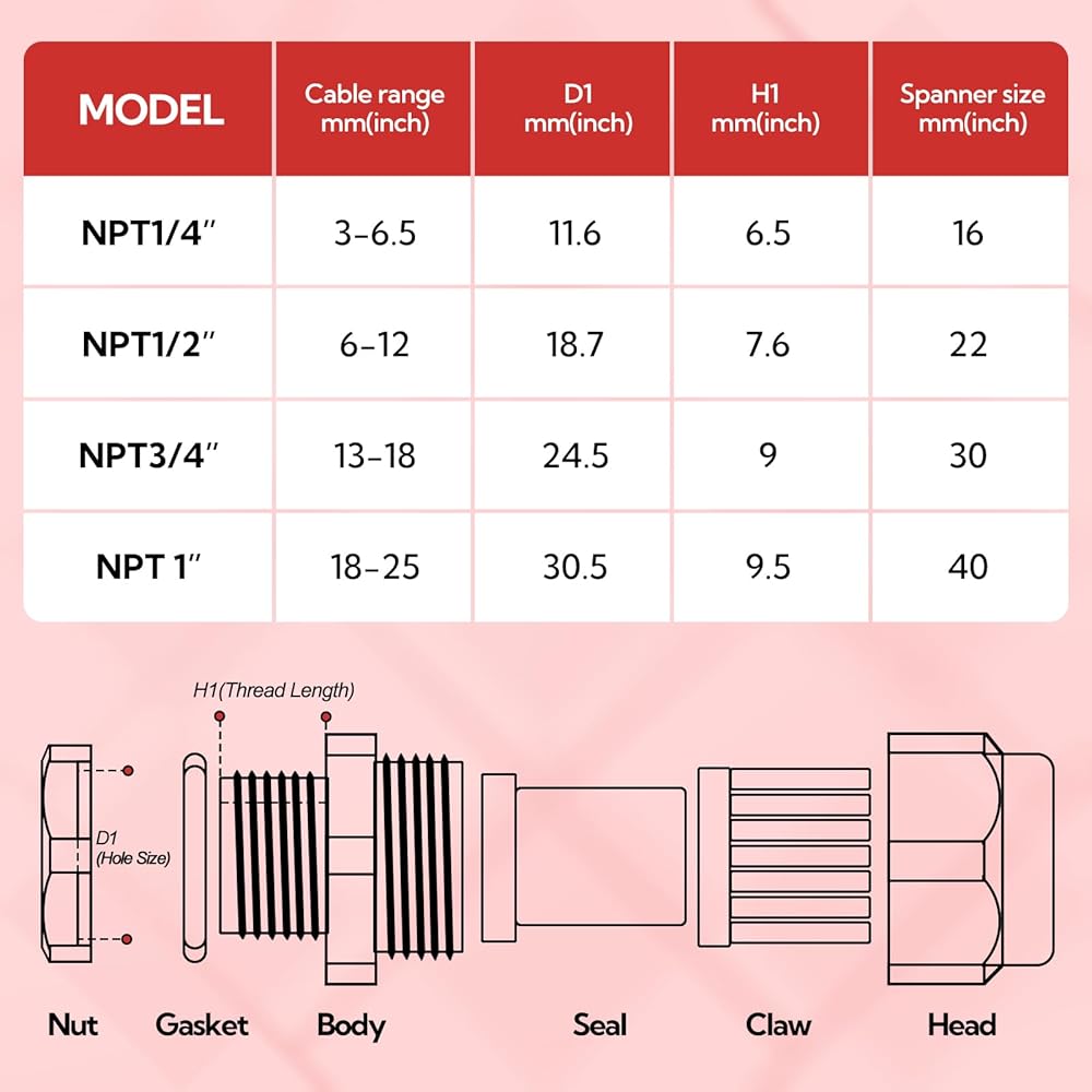 Size: 1/4"NPT, Cable range: 3-6.5mm (NPT Thread Size is a Nominal Pipe Size, and it Does Not represent the actual diameter)