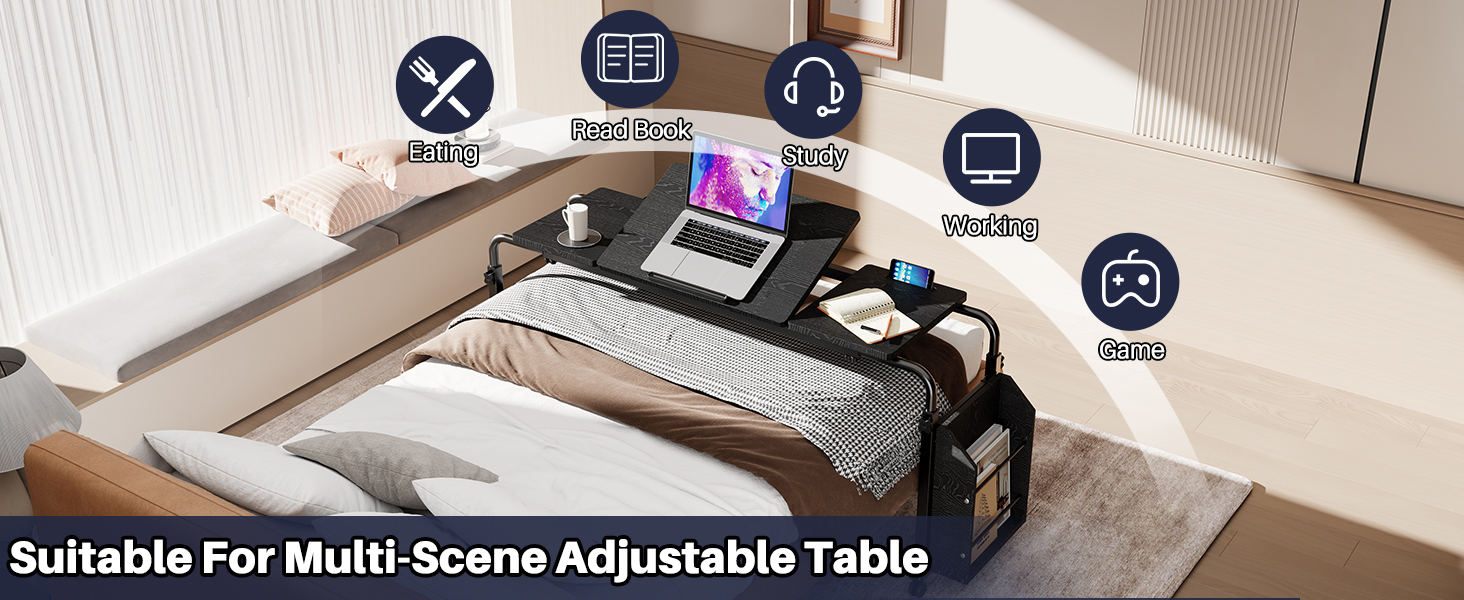 • الرف الجانبي: يتميز هذا المكتب الموجود فوق السرير برف جانبي يمكن تثبيته بحرية على جانبي جسم الطاولة. إنه يحمل بشكل مريح العناصر المستخدمة بشكل متكرر مثل الكتب والمستندات والمجلات، مما يحافظ على مكتبك المنزلي ومساحة القراءة أنيقة ومنظمة