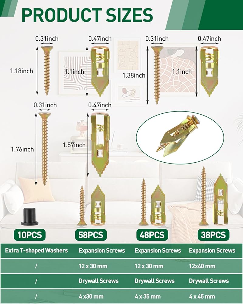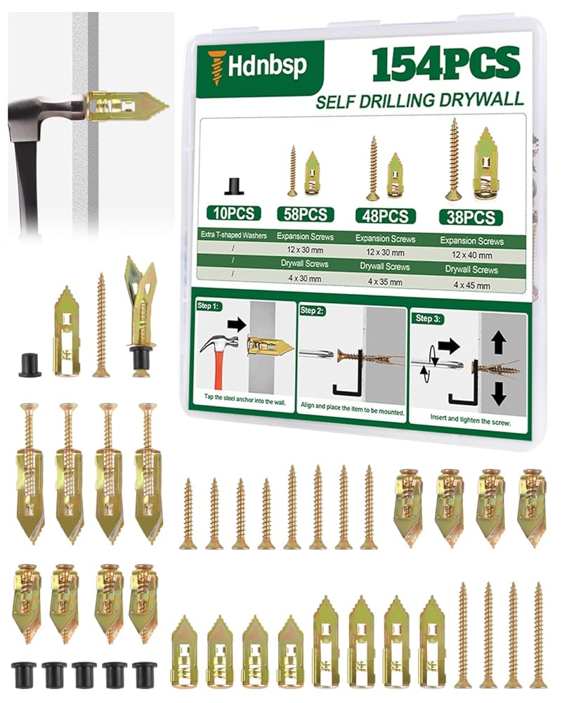 𝟏𝟓𝟒𝐏𝐂𝐒, 𝟑 𝐒𝐢𝐳𝐞𝐬 𝐊𝐢𝐭: مجموعة واحدة تغطي المزيد من الوظائف: ثلاثة أحجام مرساة/مسمار بالإضافة إلى غسالات على شكل حرف T - براغي التوسيع الكاملة لمجموعة الحوائط الجافة. قم بمطابقة الحجم مع الوزن من أجل تركيب أكثر أمانًا وذكاءً. تم تنظيمها بدقة في صندوق يحمل علامة حتى تتمكن من الإمساك والمطابقة والتركيب دون البحث عن الأجزاء.