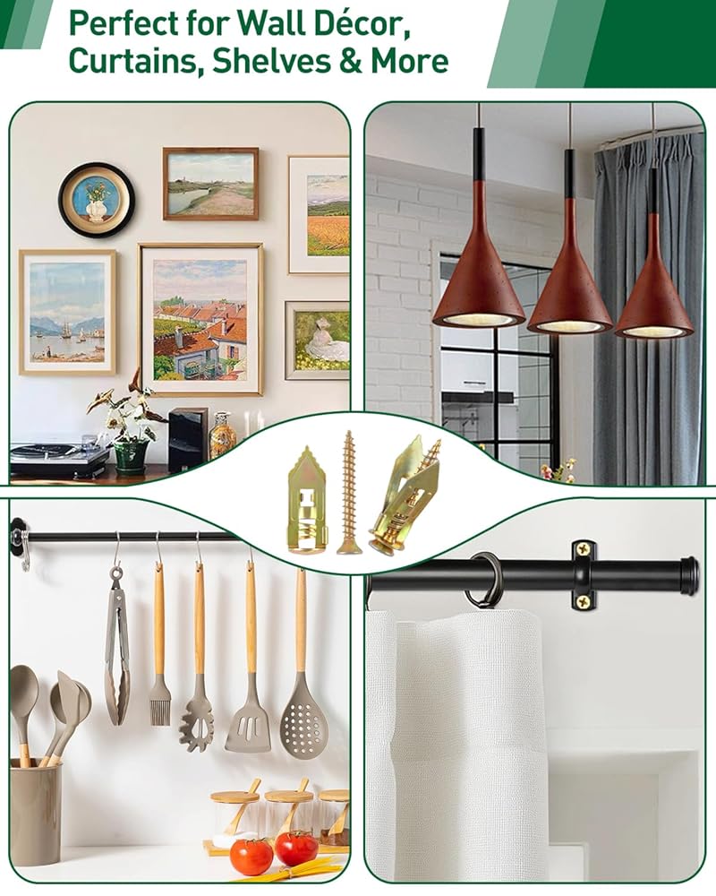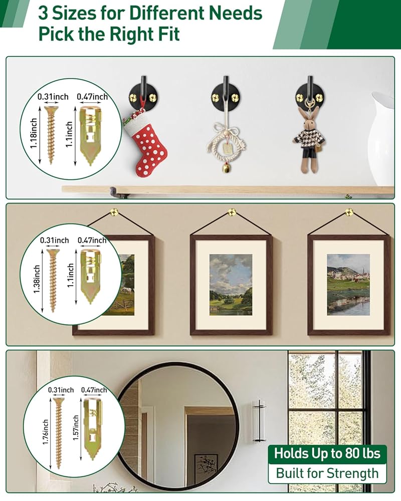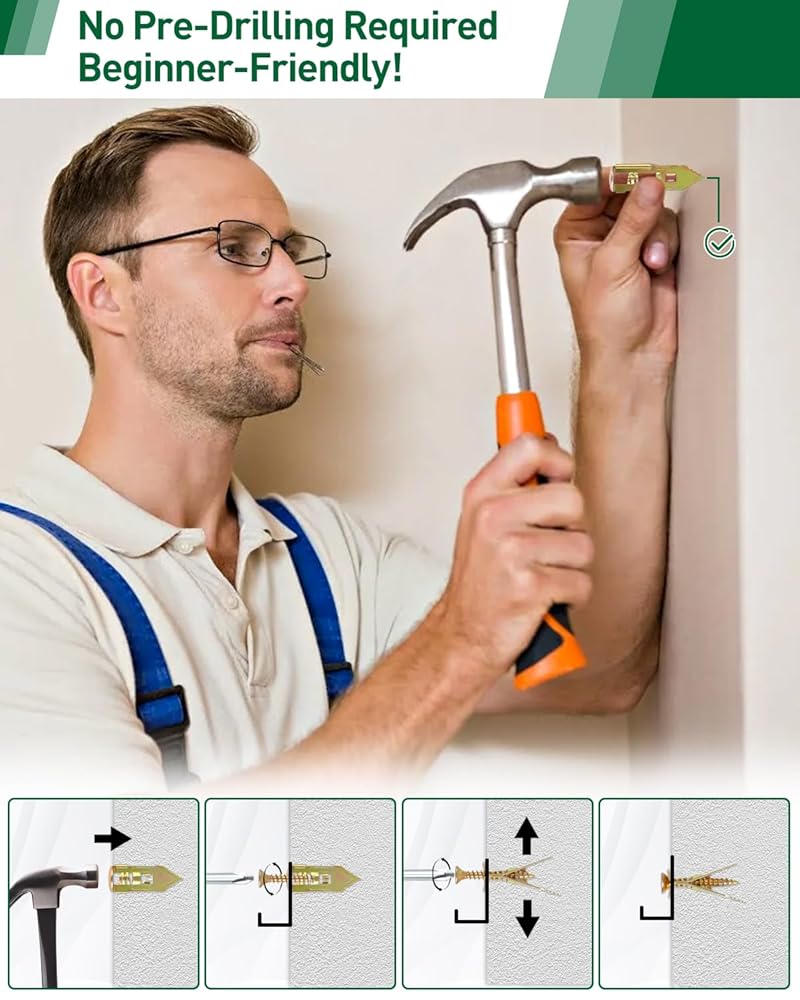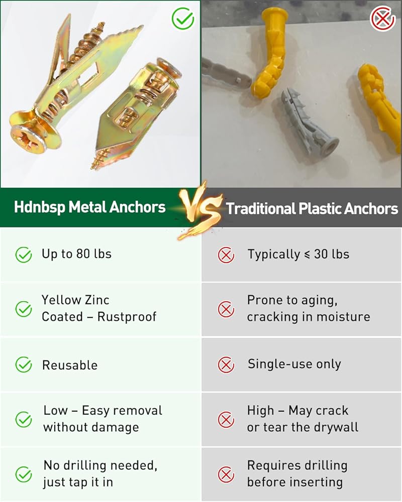 𝐇𝐞𝐚𝐯𝐲-𝐃𝐮𝐭𝐲 𝐌𝐞𝐭𝐚𝐥 𝐇𝐨𝐥𝐝: توفر مثبتات الحائط المعدنية المصنوعة من الفولاذ المطلي بالزنك 100 رطل + قوة فئة للمرايا والإطارات والأرفف وأقواس التلفزيون - تعمل مثل المعدن مسمار توسيع للحوائط الجافة من أجل قبضة محكمة وآمنة. هيكل متين ومقاوم للصدأ يدوم أكثر من المقابس البلاستيكية والمفاتيح الواهية (مثبتات الحوائط الجافة المعدنية شديدة التحمل). يختلف الحمل حسب الجدار والتركيب.