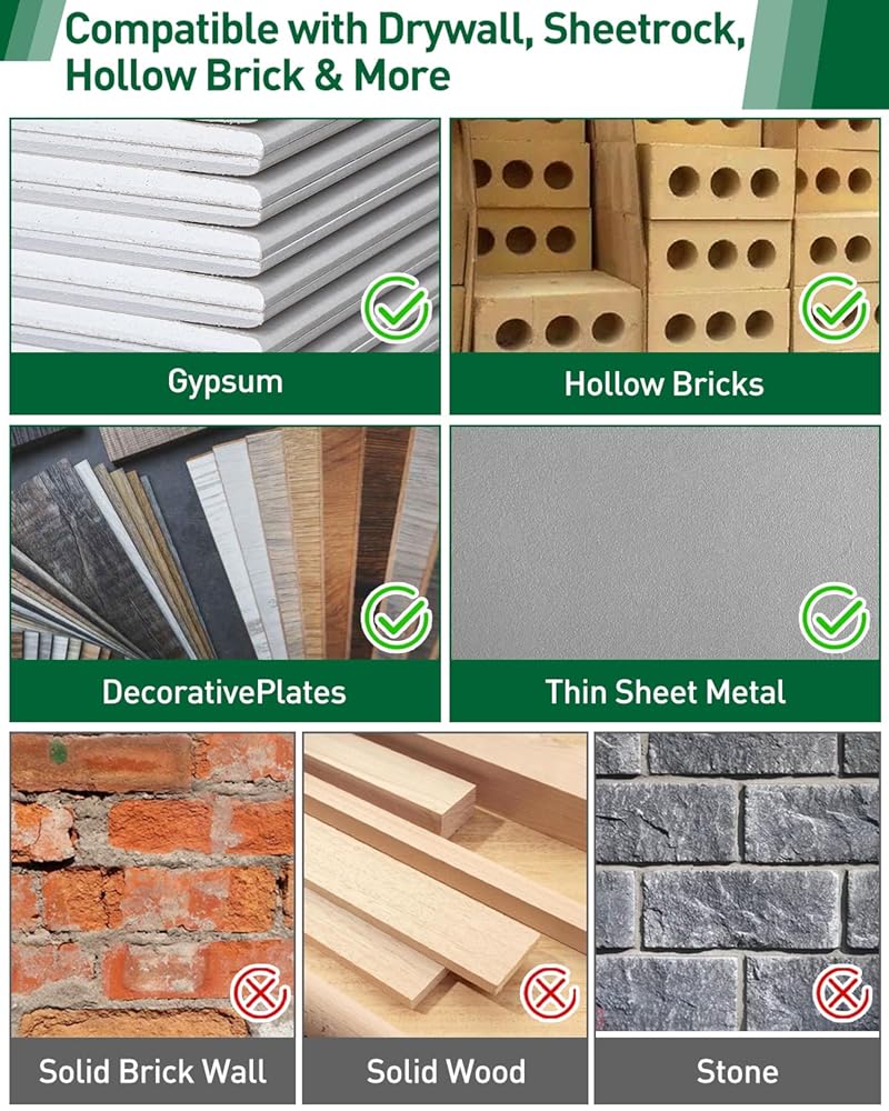 𝐔𝐒 𝐃𝐫𝐲𝐰𝐚𝐥𝐥 𝐂𝐨𝐦𝐩𝐚𝐭𝐢𝐛𝐥𝐞: مصمم للجدران الأمريكية الشائعة: 3/8"، 1/2"، 5/8" من الألواح الصخرية - تعمل كألواح صخرية مثبتة على الحوائط الجافة و مثبتات جدارية مجوفة للجدران الجافة، وعلى الألواح الخشبية الرقيقة، ليست مخصصة للخرسانة الصلبة/الطوب/البلاط/الحجر للجص واللوح القديم، قم بالاختبار أولاً أو الحفر مسبقًا واستخدم الأحمال الخفيفة.
