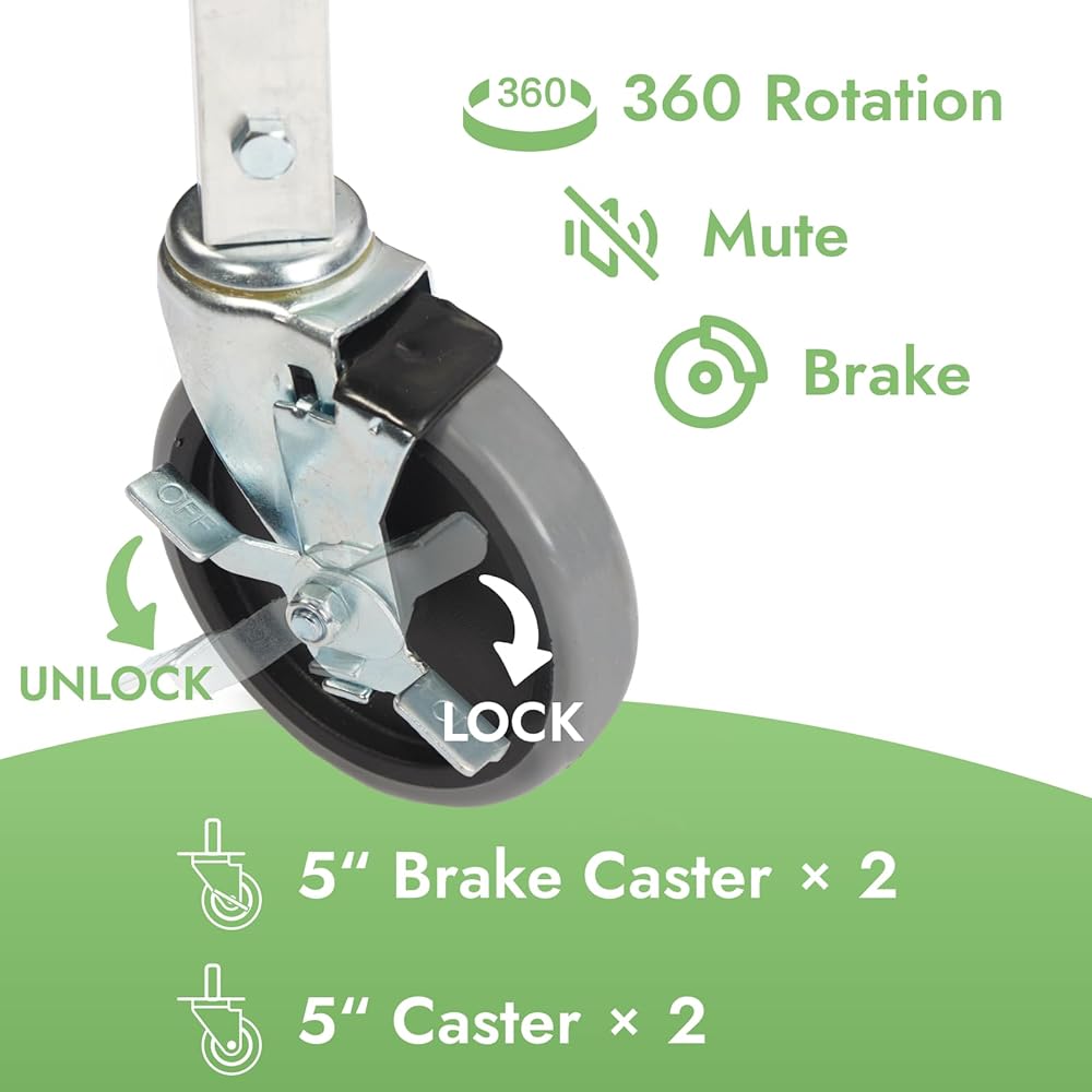 نظام الفرامل الآمن: تم تجهيز اثنتين من العجلات الأربع بفرامل، مما يوفر الثبات والأمان. قم بتثبيت الفرامل في مكانها لإبقاء الحامل ثابتًا عند الرغبة، مما يمنع أي حركة غير مقصودة.