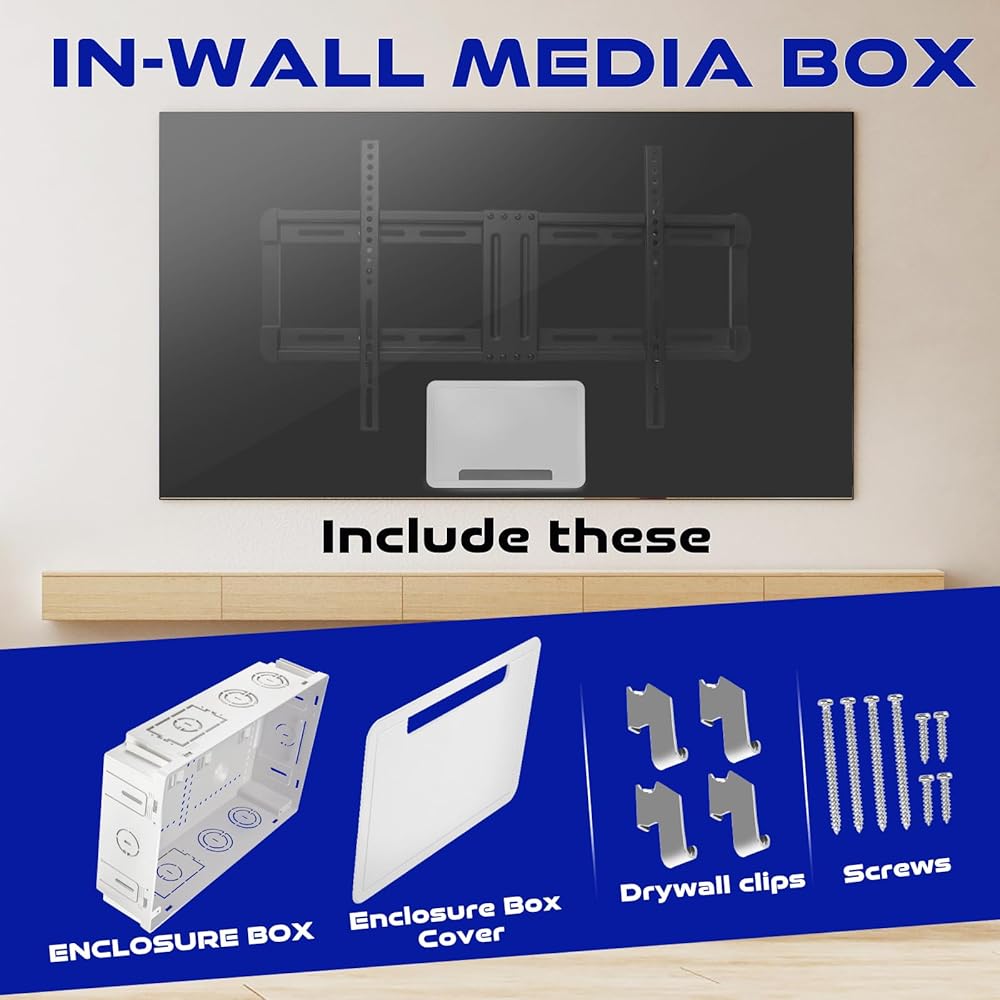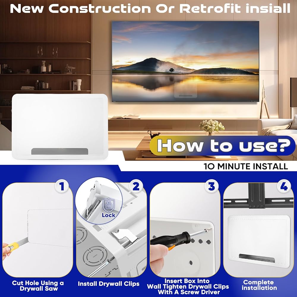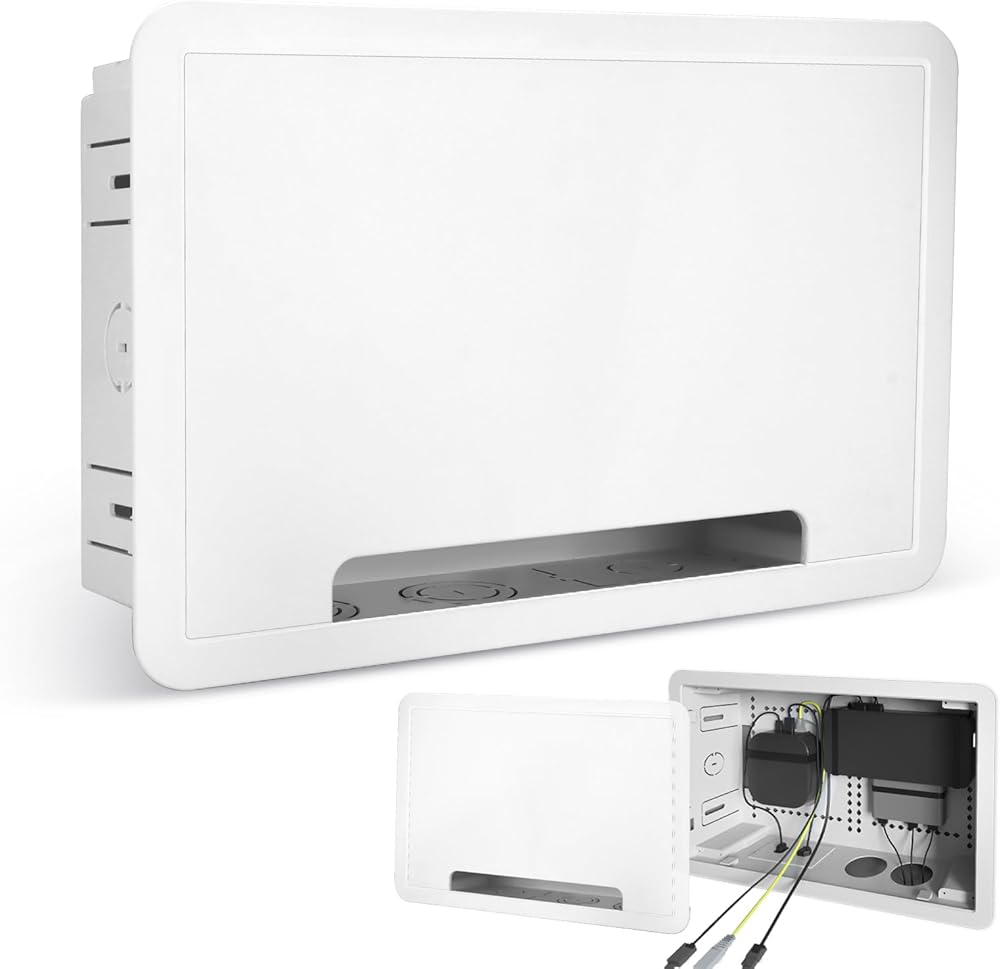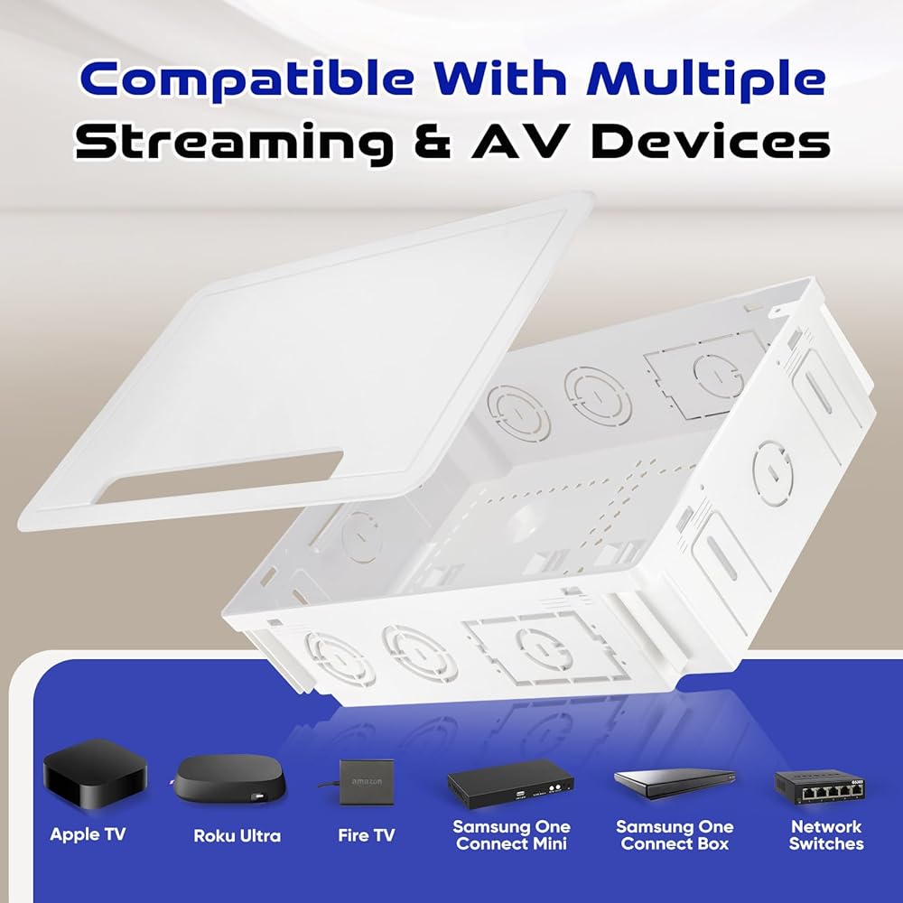 تصميم أنيق ومثبت على نحو سلس: تخلص من الفوضى واحصل على مظهر احترافي سلس. يتم تركيب صندوق الوسائط هذا مقاس 9 بوصة داخل حائطك، مما يخفي تمامًا الكابلات المتشابكة وشرائط الطاقة وأجهزة الوسائط مثل Apple TV أو Roku، مع الحفاظ على سهولة الوصول إليها