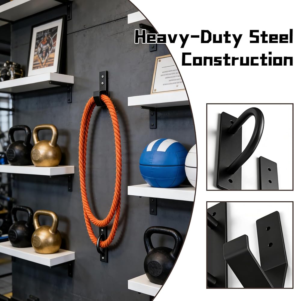 This heavy-duty steel battle rope anchor kit serves as a reliable wall mount for 30-50 feet, 1"-2.5" battle ropes, ensuring stable support for intense dynamic training. Equipped with a built-in storage hook, it keeps battle ropes organized to avoid clutter. The kit includes all necessary hardware for easy wall/ceiling installation, boasting wide compatibility not only with battle ropes but also with suspension trainers, resistance bands, and gymnastic rings, making it a versatile addition to home and commercial gyms.