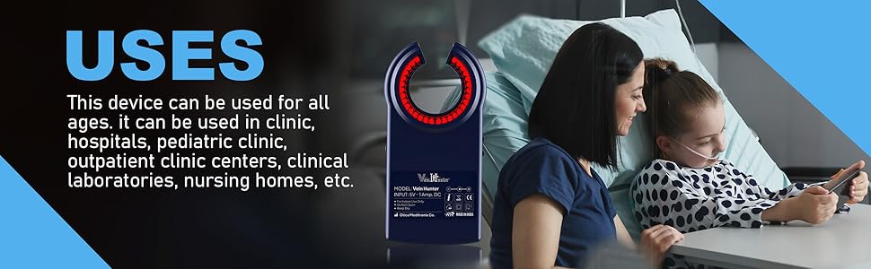• تساعد تقنية مكتشف الأوردة بالأشعة تحت الحمراء على تحديد موقع الأوردة السطحية على البشرة الداكنة وكبار السن والمرضى الذين يعانون من الأوردة الصعبة.