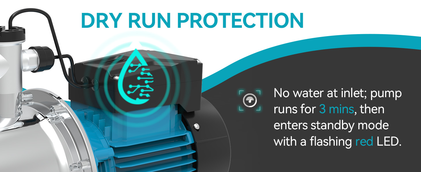 حماية منخفضة للمياه: إذا كان مدخل المضخة يفتقر إلى مصدر للمياه، فسوف تستمر في العمل لمدة 3 دقائق قبل التبديل إلى وضع الاستعداد. سيومض ضوء LED باللون الأحمر للإشارة إلى هذه الحالة، مما يمنع حدوث ضرر محتمل.