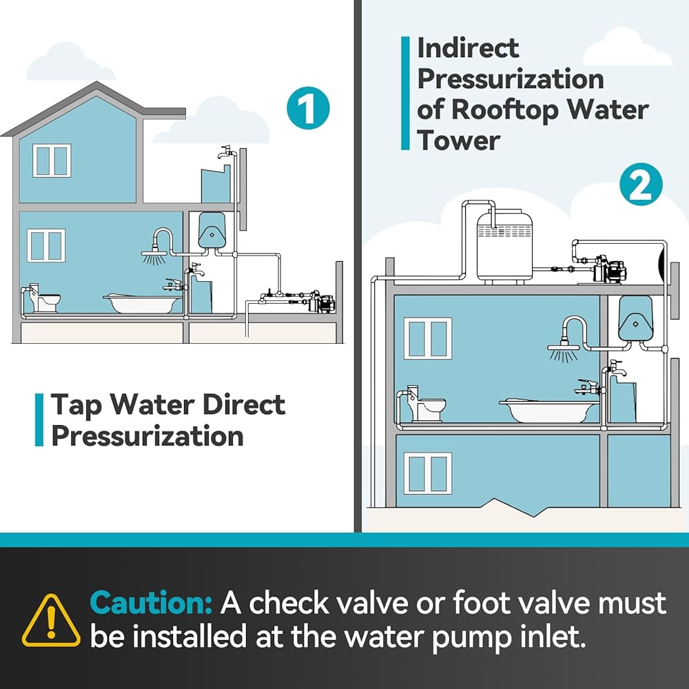 التشغيل/الإيقاف التلقائي: تتميز المضخة بوظيفة التشغيل/الإيقاف التلقائي الفعالة والموفرة للطاقة، ويتم تفعيلها عندما يكون الضغط أقل من 1 بار أو عند اكتشاف تدفق المياه. ويتوقف عندما يتجاوز الضغط 1.5 بار مع عدم وجود تدفق للمياه، ويتوقف مؤقتًا بعد 10 ثوانٍ ويدخل في وضع الاستعداد مع مؤشر LED أخضر.