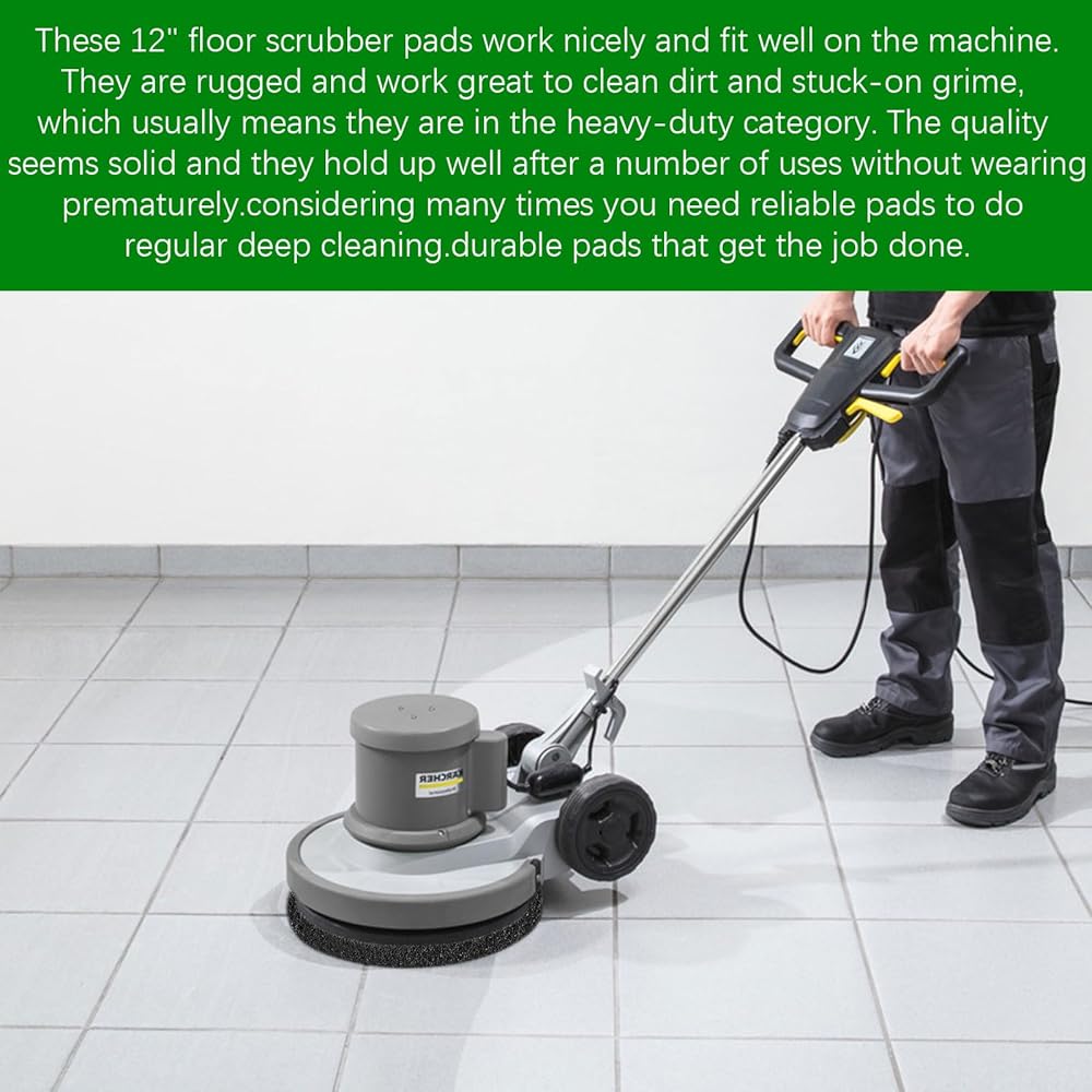 • 【Polish Orbiter Pad】This 12" black floor scrubber pads work nicely and fit well on the machine. They are rugged and work great to clean dirt and stuck-on grime, which usually means they are in the heavy-duty category. The quality seems solid and they hold up well after a number of uses without wearing prematurely.Durable Pads That Get the Job Done.