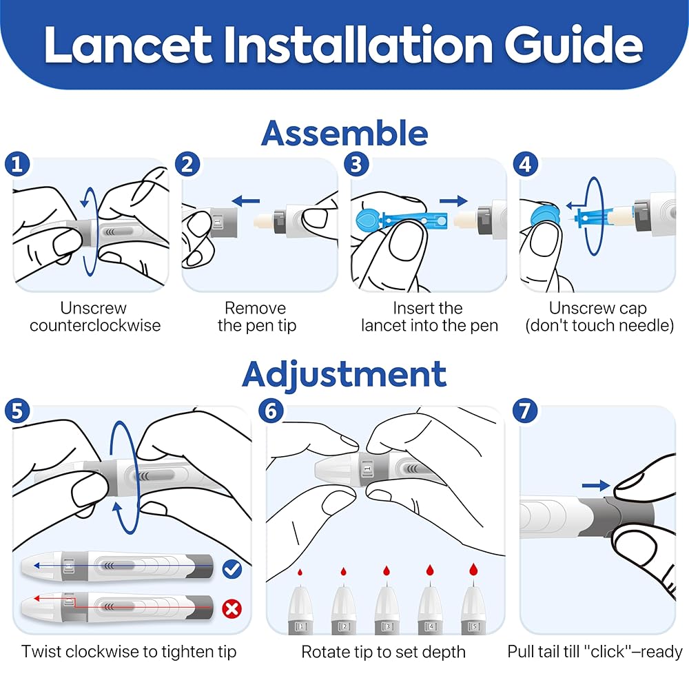 • وقت الاختبار السريع: جاهز للإخراج من الصندوق، فقط 5 ثوانٍ للعد التنازلي للاختبار اليومي. 5 مستويات من قوة الوخز مع 5 أعمق مستويات تناسب أنواع مختلفة من جلود الأصابع