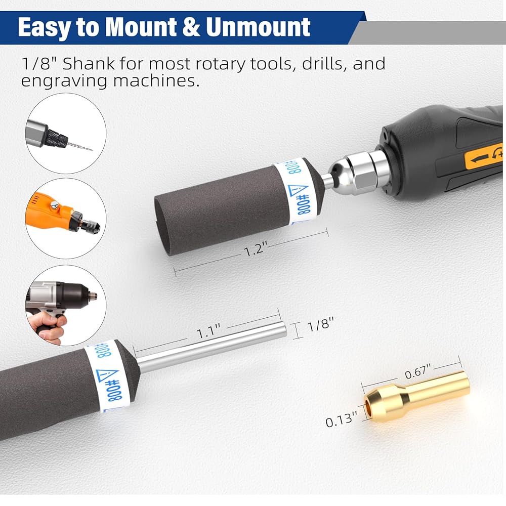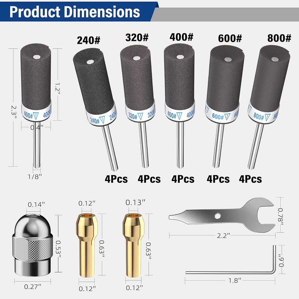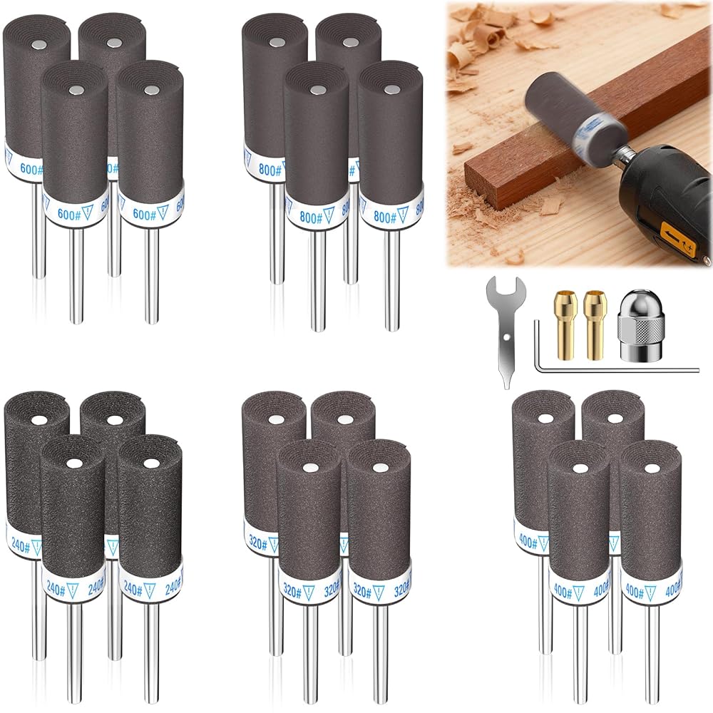 مجموعة قيمة وملاءمة عالمية - تتضمن 20 أسطوانة صنفرة: 240# (4 قطع)، 320# (4 قطع)، 400# (4 قطع)، 600# (4 قطع)، 800# (4 قطع). ساق قياسية مقاس 1/8 بوصة تناسب معظم أدوات Dremel الدوارة والمثاقب الصغيرة والنقاشين. يتضمن أيضًا صامولة فضية إضافية وأطواق نحاسية من أجل محاذاة آمنة. السرعة الموصى بها: 5,000 دورة في الدقيقة.