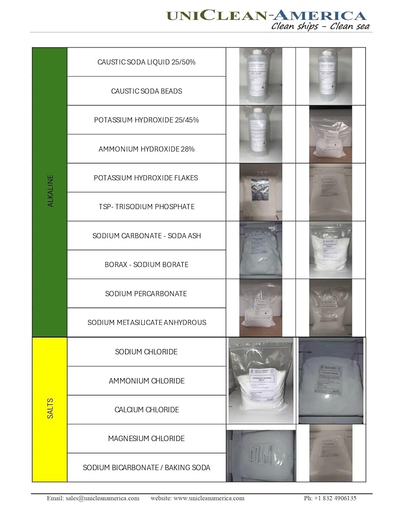 UniClean America Supply wide range of marine chemicals, tank cleaning chemicals & Raw materials, we are specialized in supplying powder form chemicals in small weights packed in reusable zipper bags, our product such as but not limited sodium thiosulphate, trisodium phosphate, trisodium polyphosphate, sodium metasilicate, sodium metabisulfite, citric acid, oxalic acid, sulfamic acid, EDTA.4NA, EDTA.2NA, cetyl alcohol, stearyl alcohol, PVP K30 , HEC, TKPP, ammonium chloride, calcium chloride, magnesium chloride, ammonium bifluoride, sodium perborate, sodium percarbonate, sodium carbonate, sodium bicarbonate, sodium hexametaphosphate, sodium bisulfate .