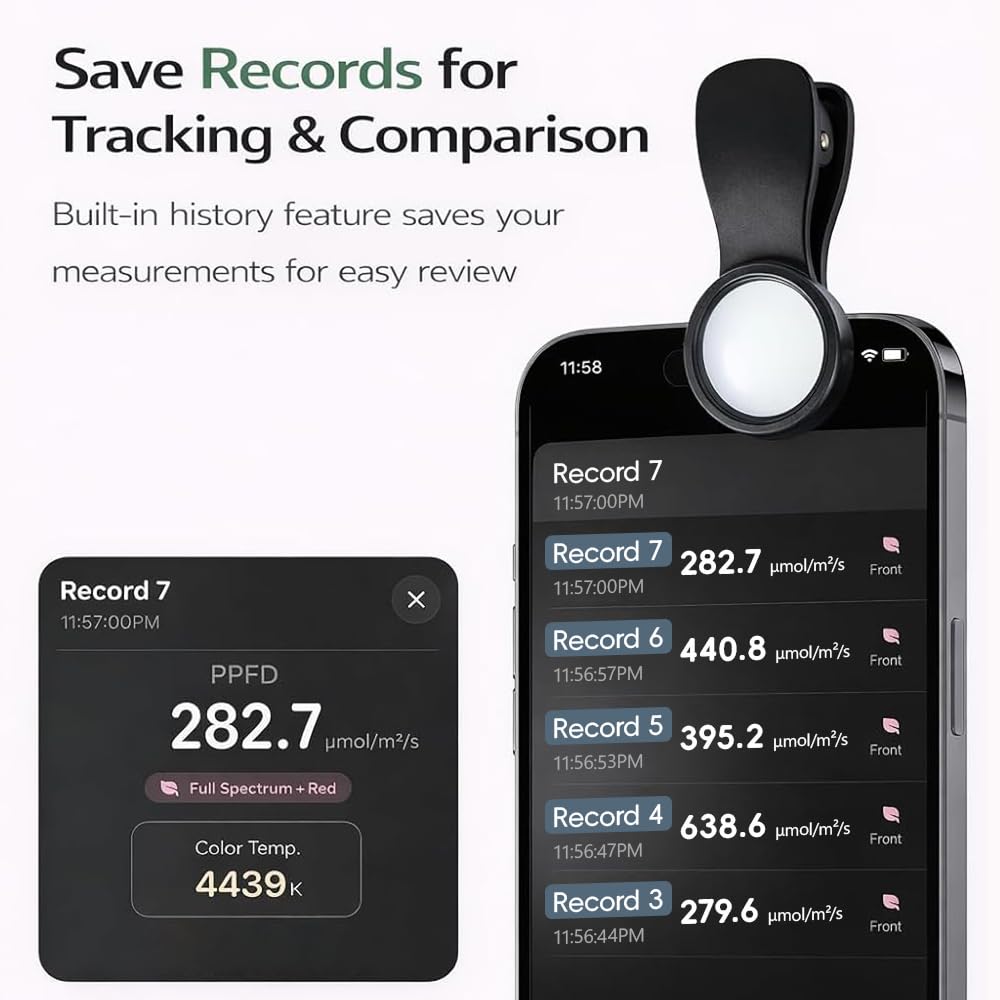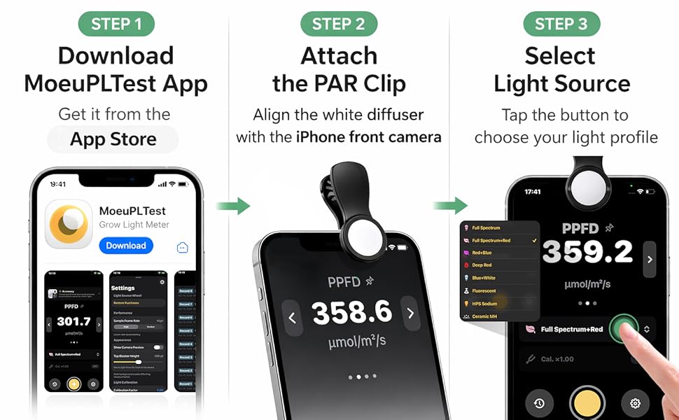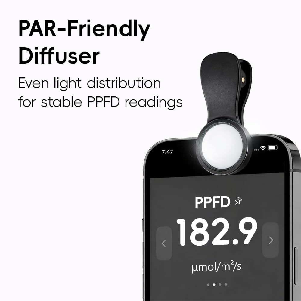 قم بتنزيل تطبيق MoeuPLTest PAR أولاً قبل شراء المقطع، يمكنك تنزيل تطبيق MoeuPLTest PAR لاستكشاف الواجهة وفهم كيفية عرض القياسات. يعمل المقطع مع التطبيق ويتم تثبيته على كاميرا iPhone الأمامية لقياس PPFD (ميكرومول/م²/ثانية) من أضواء النمو.