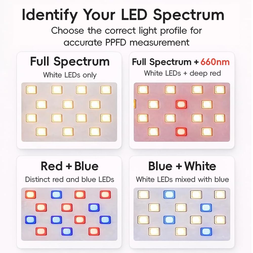 يتضمن تطبيق MoeuPLTest PAR ملفات تعريف إضافية لمصدر الضوء لأنواع مختلفة من مصابيح النمو، بما في ذلك: الطيف الكامل، الأحمر + الأزرق، الأحمر العميق، الأزرق + الأبيض، الفلورسنت، HPS الصوديوم، ضوء الشمس. يمكن تمكين ملفات التعريف هذه داخل التطبيق عند الحاجة.