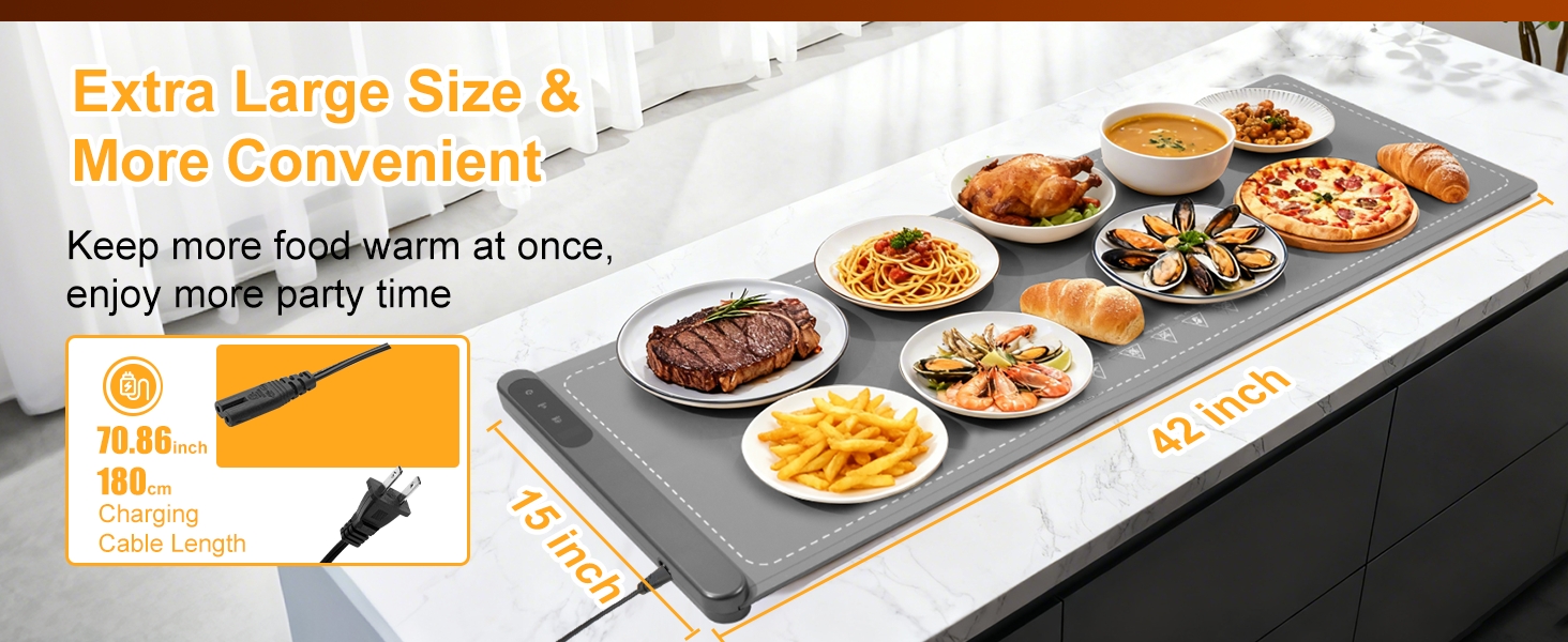 • ✅【حجم كبير جدًا 42 بوصة × 15 بوصة مثالي للحفلات وكابل شحن 7.8 بوصة】سجادة تسخين الطعام الكهربائية مقاس XXL مقاس 42 بوصة × 15 بوصة تناسب بشكل مريح أطباق من 8 إلى 14 بوصة. كما أنها مناسبة لـ 99% من أدوات المائدة، فقط ضعها بحرية. يأتي مع كابل شحن مقاس 7.8 بوصة، مثالي للعائلات الكبيرة والبوفيه والحفلات والترفيه