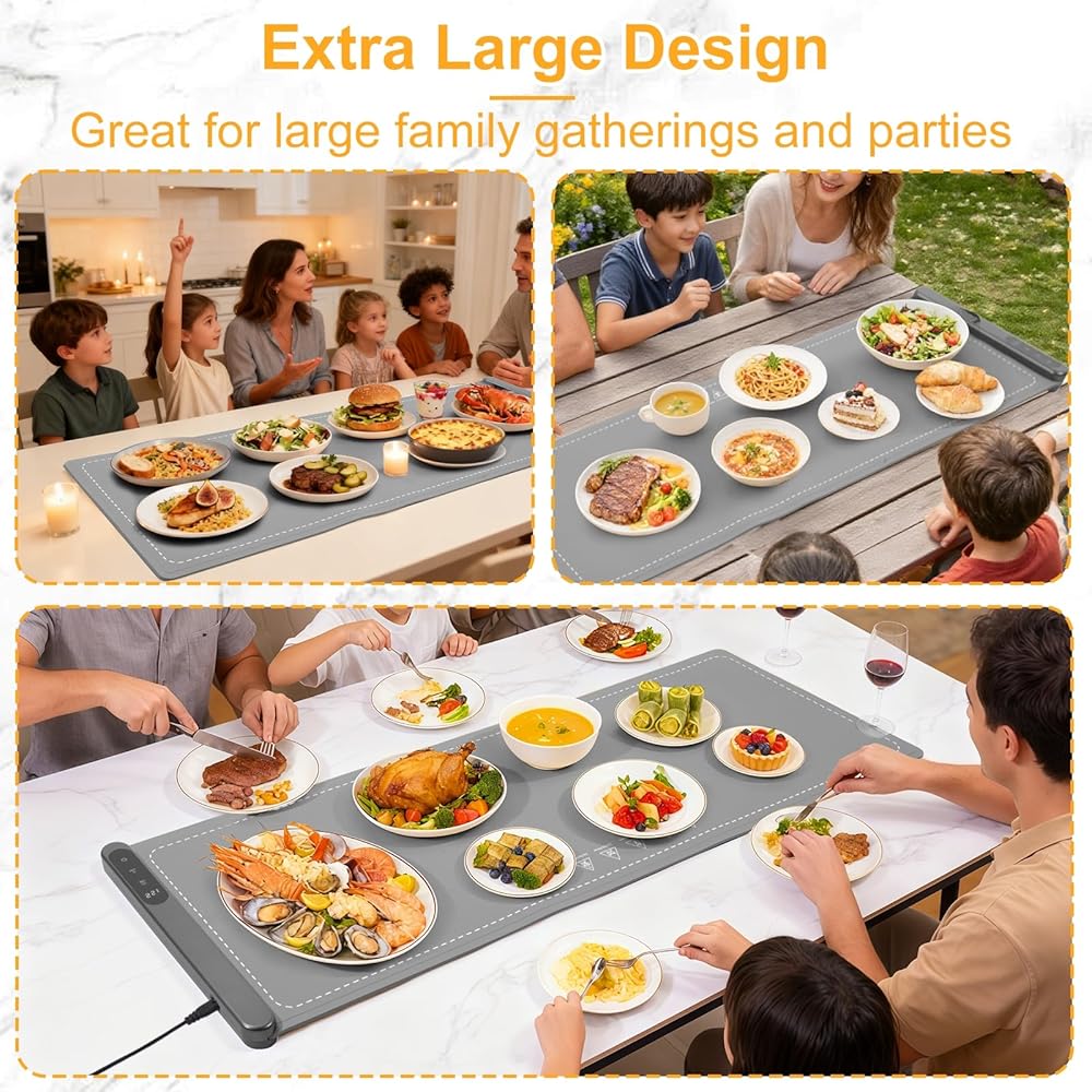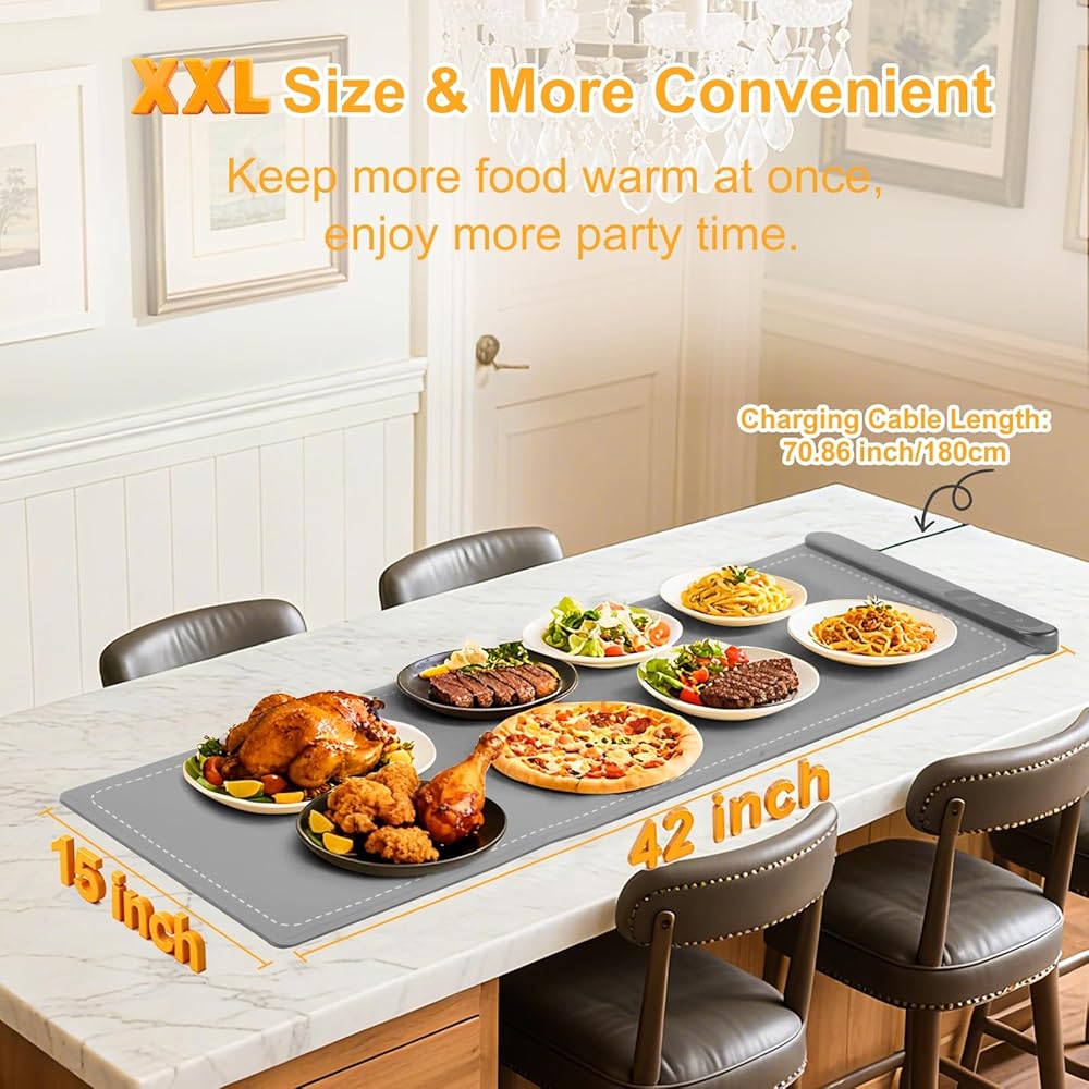 حصيرة تدفئة الطعام الكبيرة، XXL (42 بوصة × 15 بوصة) سجادة تسخين الطعام الكهربائية مع وسادة مقاومة للحرارة للكونترتوب، تسخين 6 مستويات لدرجة الحرارة ومؤقت 6 ساعات، صواني تسخين قابلة للطي لحفلات البوفيهات، رمادي