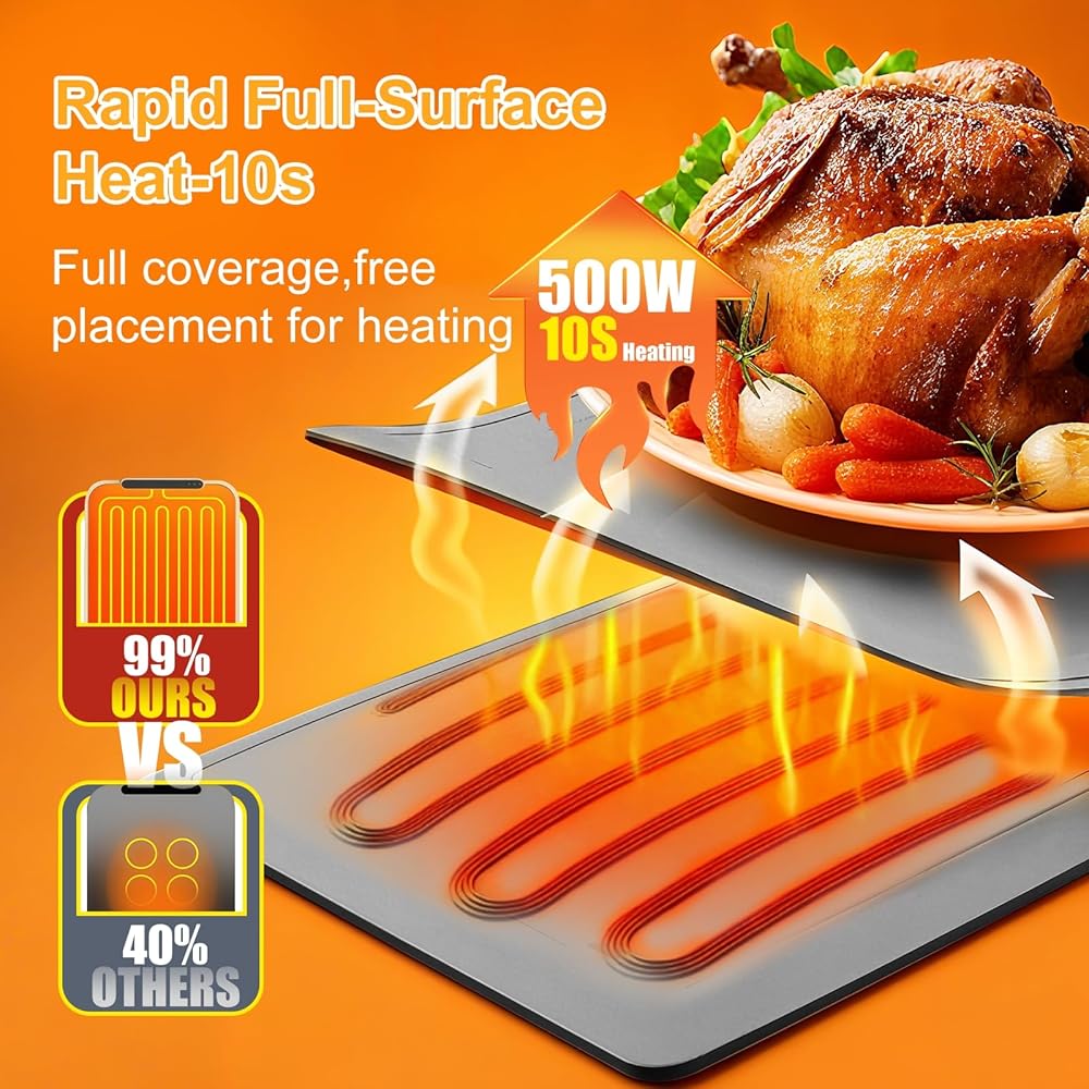 • ✅[تسخين سريع لمدة 10 ثوانٍ - سخان طعام كبير جدًا] تتميز حصيرة تدفئة الطعام الكبيرة لدينا بأسلاك تسخين مطورة تغطي القاعدة بأكملها (560 وات/110 فولت)، مما يحقق تسخينًا سريعًا في 10 ثوانٍ فقط. فهو يضمن دفءًا ثابتًا عبر السطح بأكمله (باستثناء الحواف المقاومة للحرارة)، مما يحل مشكلة التسخين غير المتساوي في ألواح التسخين التقليدية. يستوعب أطباق بأحجام متعددة، مما يجعله مثاليًا للتجمعات على طراز البوفيه. ملحوظة: هذا المنتج يعمل على تسخين الطعام بمنفذ كهربائي لنا