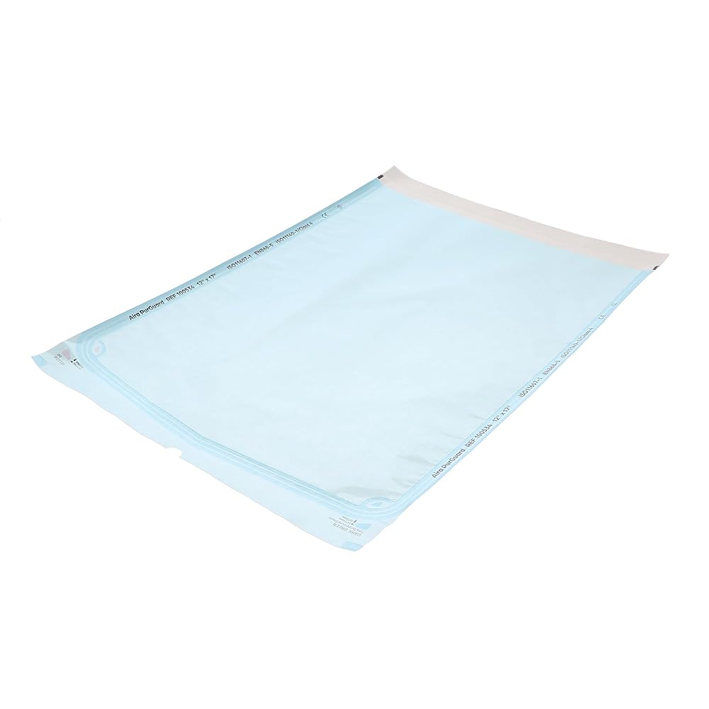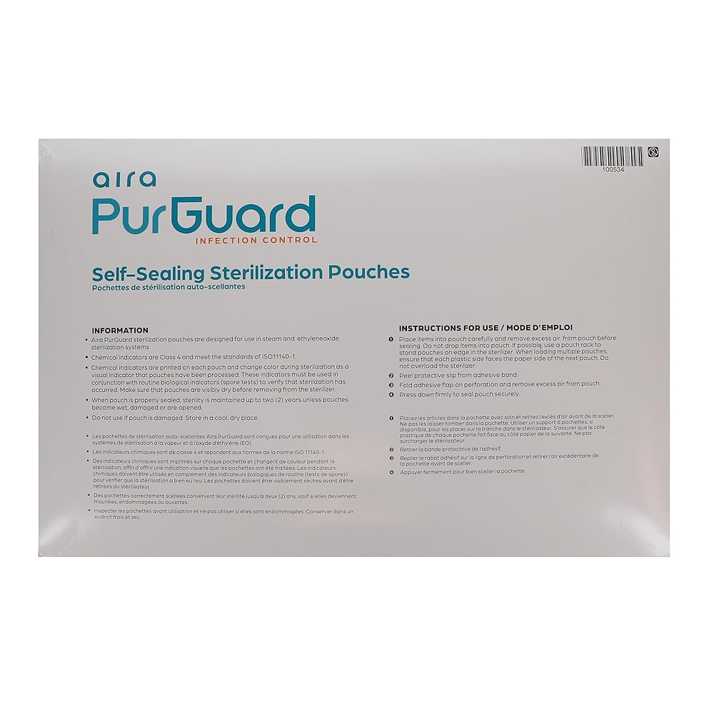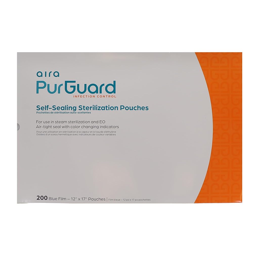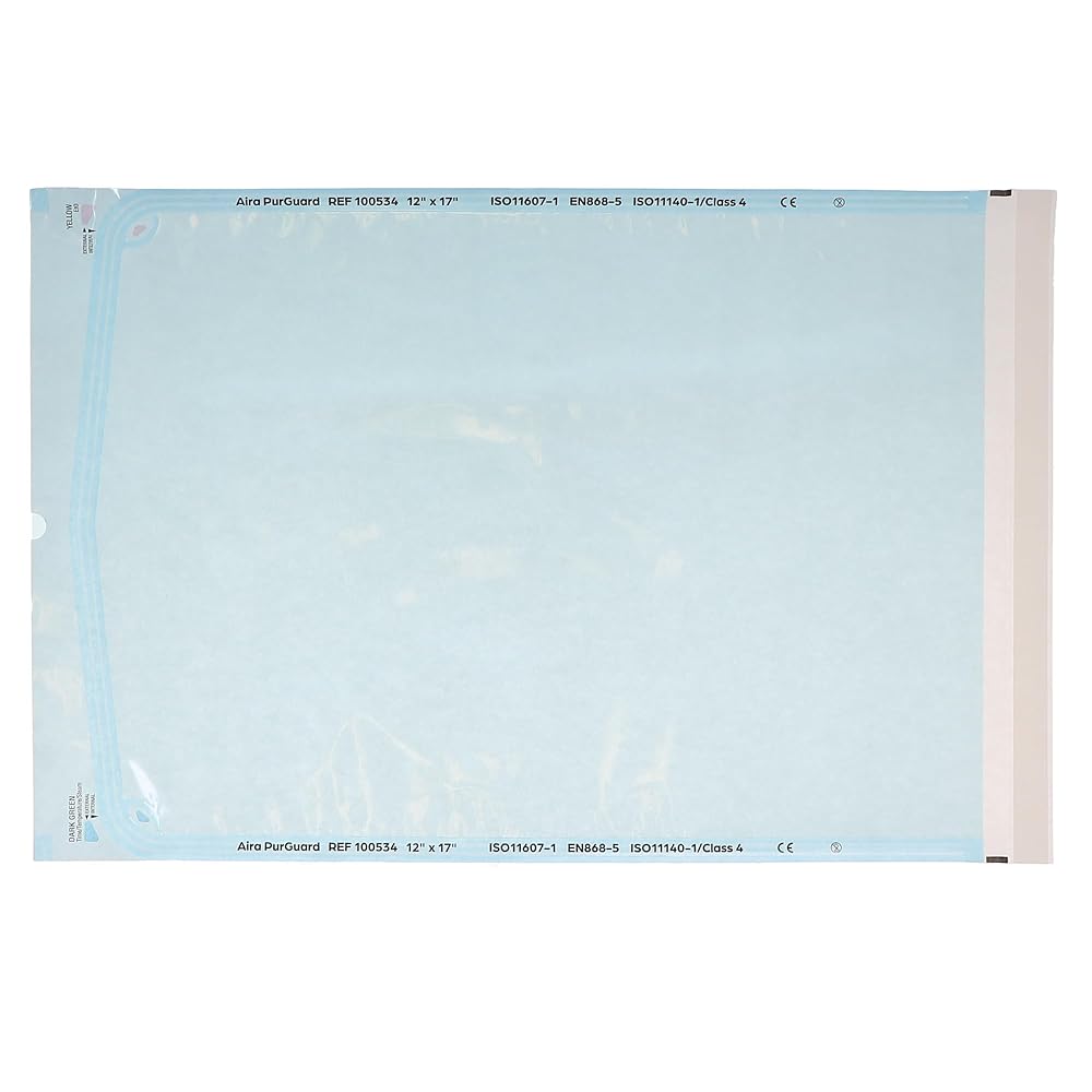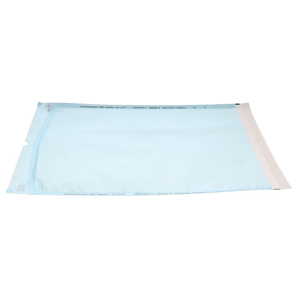Aira 100534 PurGuard Self-Sealing Sterilization Pouches 12" X 17" Paper Blue Film 200/BxExcellent instruments that provide an air-tight seal during the sterilization process. These pouches come with steam indicators to provide visual monitoring of whether the instruments achieved successful sterilization or not.