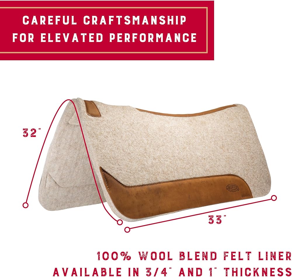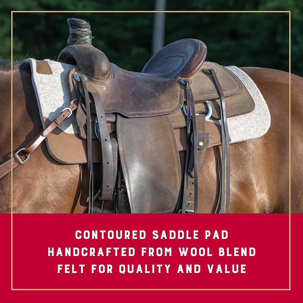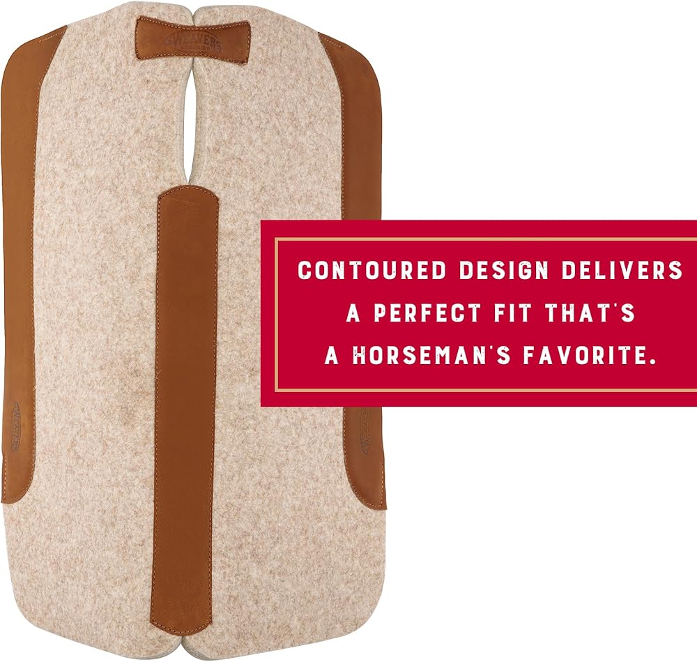 Weaver Equine Horse Pads for Saddle: Our Contoured Wool Blend Felt saddle pads are the ultimate solution for a comfortable and stable riding experience. Engineered with advanced moisture wicking and shock-absorbing technology, this soft saddle pad effectively relieves pressure points, ensuring your rides are smooth and enjoyable. Crafted from high-quality imported materials, this western saddle seat cushion cover not only provides extra cushioning and moisture-wicking action but also ensures the padded horse seat remains cool and comfortable, even during long rides. Hand wash recommended for lasting design and feel. Careful craftsmanship and exceptional fit allows you to focus on your ride without constant adjustments. The western horse tack pad equally distributes weight, reducing strain on both your back and your horse's back. With its innovative design, this horse pad alleviates pressure points, promoting better control, training performance and endurance for both rider and horse. Whether you're a casual rider or a seasoned equestrian, our diverse saddle pads are a must-have for anyone seeking extra comfort and stability. An indispensable equine accessory, horse saddle pads make great gifts for horse owners and riders alike.