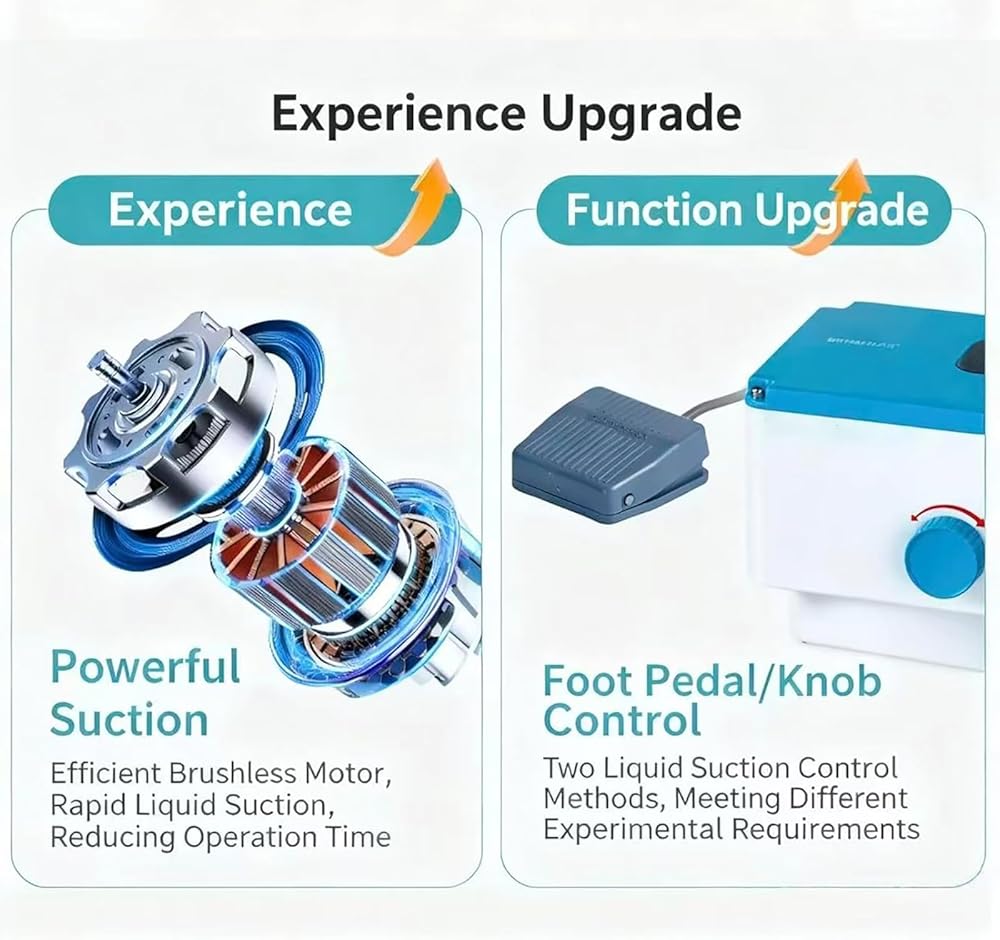 ➤ Powerful Brushless Motor: Equipped with a high-efficiency brushless motor, this aspirator delivers robust, adjustable suction (1.6L/min) to quickly handle liquids of varying viscosities, significantly boosting workflow efficiency