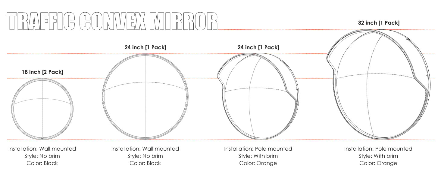 • مثبتة على الجدران أو الأعمدة --- تتضمن مجموعة التثبيت. تشتمل المرايا على دعامات تثبيت شديدة التحمل مما يسمح بسهولة التركيب في معظم المواقع، كما أن التثبيت والنقل كلاهما بسيط للغاية