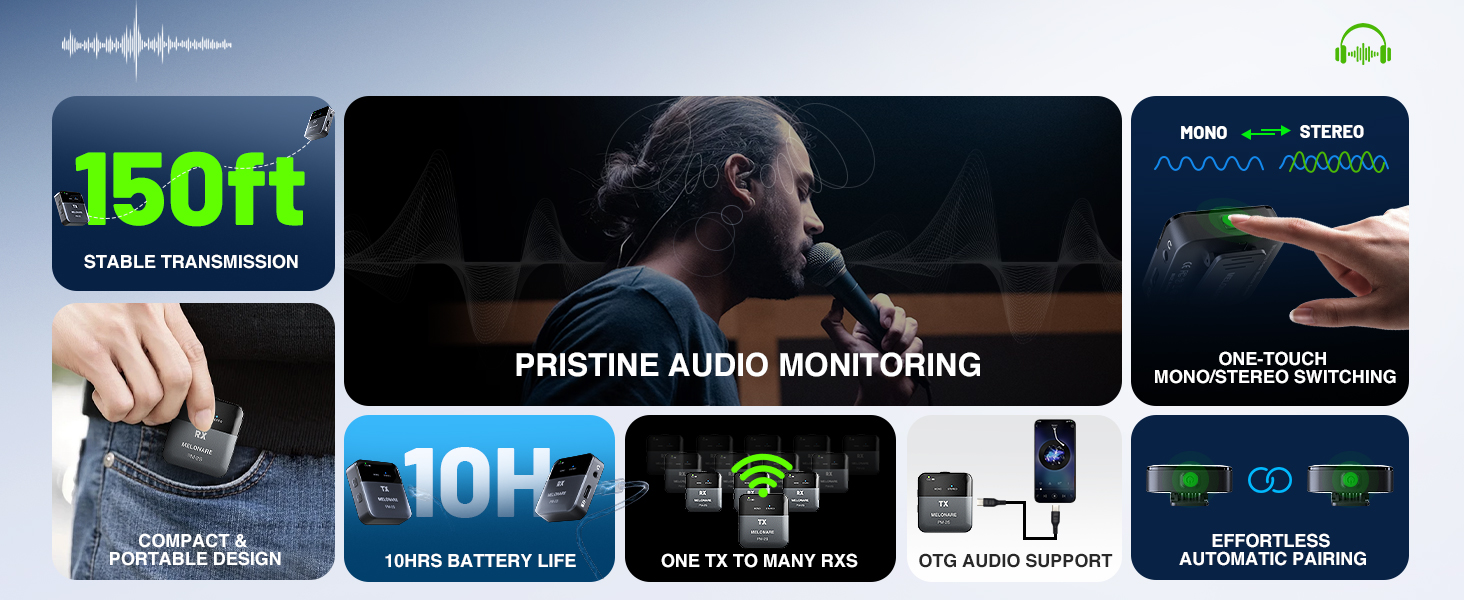 مراقبة لاسلكية واحدة إلى عدة 150 قدم: يمكن لجهاز إرسال حزامي واحد الاتصال بأجهزة استقبال متعددة، كل منها مزود بتحكم مستقل في مستوى الصوت. يدعم نظام IEM أيضًا ما يصل إلى 10 مجموعات كاملة تعمل في وقت واحد دون تداخل، مما يوفر نطاقًا لاسلكيًا ثابتًا يصل إلى 150 قدمًا. يتيح الاقتران التلقائي السريع الاتصال الفوري عند التشغيل، وهو مثالي للأحداث الحية وأطقم المسرح والبروفات