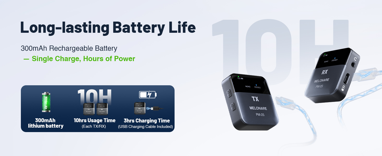 بطارية قابلة لإعادة الشحن تدوم طويلاً بقدرة 300 مللي أمبير في الساعة: تتميز ببطارية ليثيوم مدمجة قابلة لإعادة الشحن بقدرة 300 مللي أمبير في الساعة، حيث يوفر كل من جهاز الإرسال والاستقبال أكثر من 10 ساعات من الاستخدام المستمر بشحنة واحدة. استمتع بمراقبة لاسلكية سلسة ومتواصلة مع وقت توقف أقل وكفاءة أكبر - مما يجعلها مثالية للتدريبات الطويلة والمؤتمرات والعروض الحية.