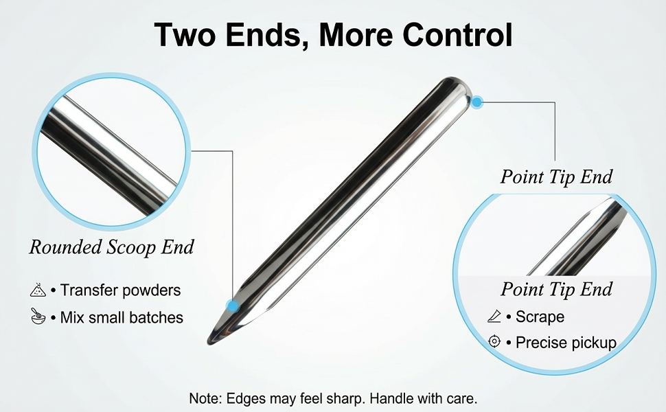 تصميم مزدوج الأطراف: تحتوي الملعقة المعدنية الخاصة بنا على مغرفة مستديرة وطرف مدبب على الأطراف المقابلة، مصممة بقسم عرضي شبه دائري. تصميم المختبر هذا يجعله مثاليًا للتعامل مع المساحيق والخرز والمواد الأخرى