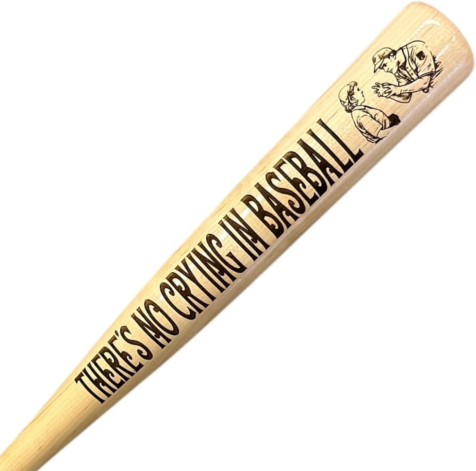 Channel the spirit of the classic 1992 film A League of Their Own with this stunning full-size baseball bat, expertly engraved with the unforgettable line "There's No Crying in Baseball!" Delivered with unforgettable flair by Tom Hanks as manager Jimmy Dugan, this quote has become one of cinema's most beloved motivational moments—and now it's immortalized on a genuine full-length wooden bat. Crafted from premium natural wood, this authentic full-size bat (approximately 33-34 inches) features precision laser engraving that brings the iconic scene to life: Bold, vintage-style lettering of the full phrase along the barrel A detailed illustration capturing the dramatic moment: the coach emphatically gesturing to the tearful player Perfect for display in your home, office, man cave, or sports memorabilia collection, this engraved bat is more than decor—it's a tribute to baseball history, women's empowerment in sports, and timeless movie magic. It also makes an outstanding gift for coaches, players, die-hard fans of the Rockford Peaches, or anyone who appreciates tough-love humor with heart.