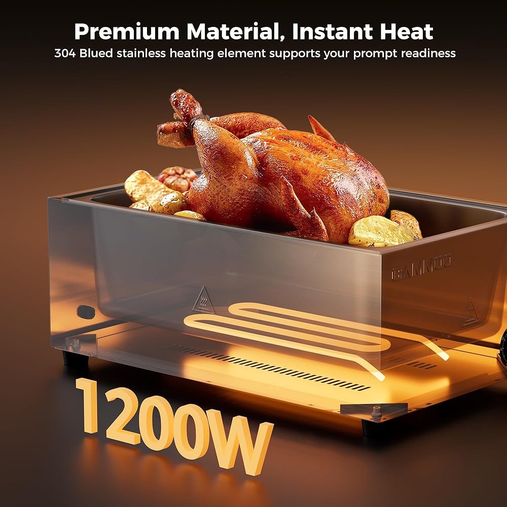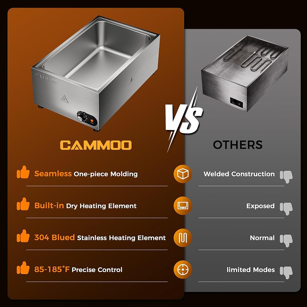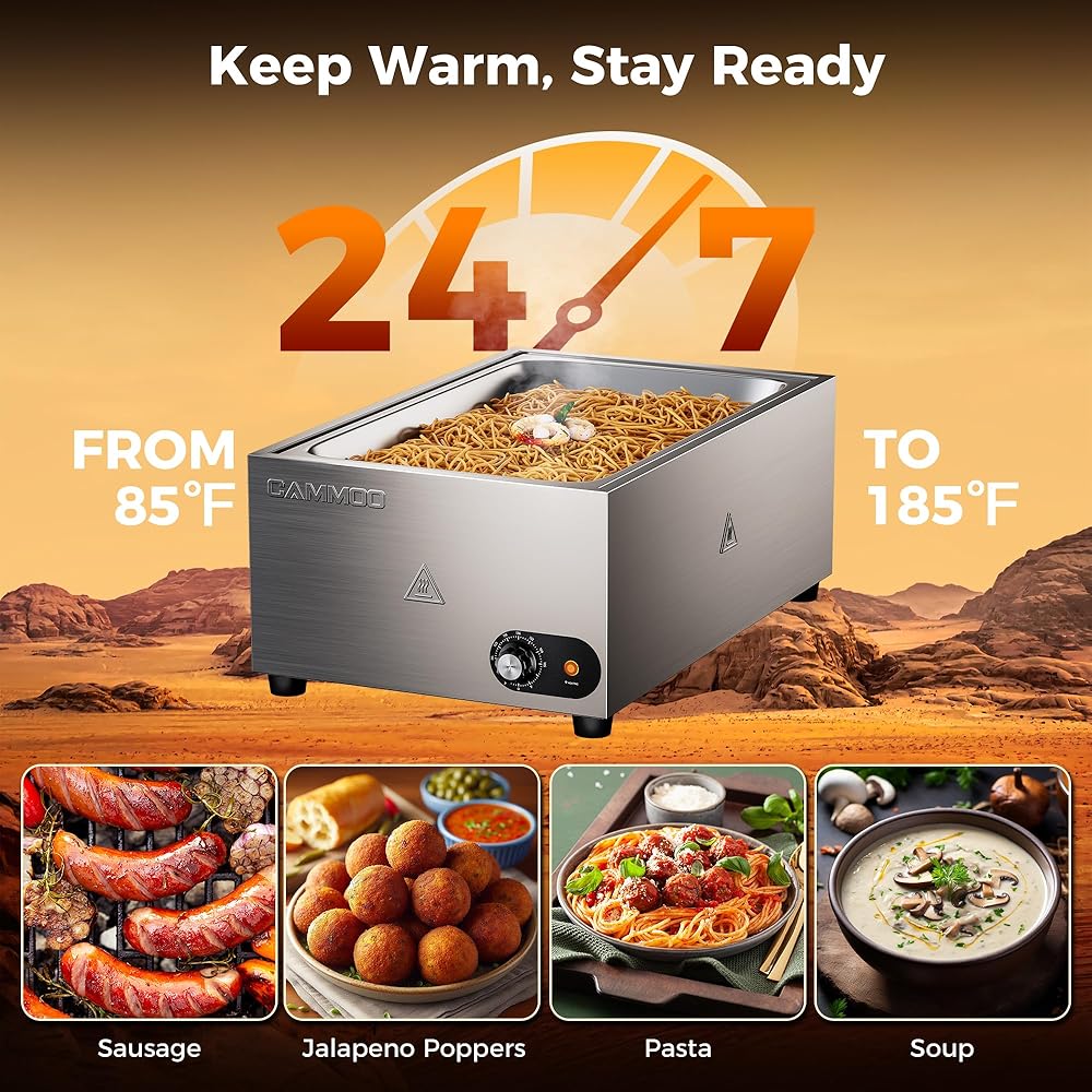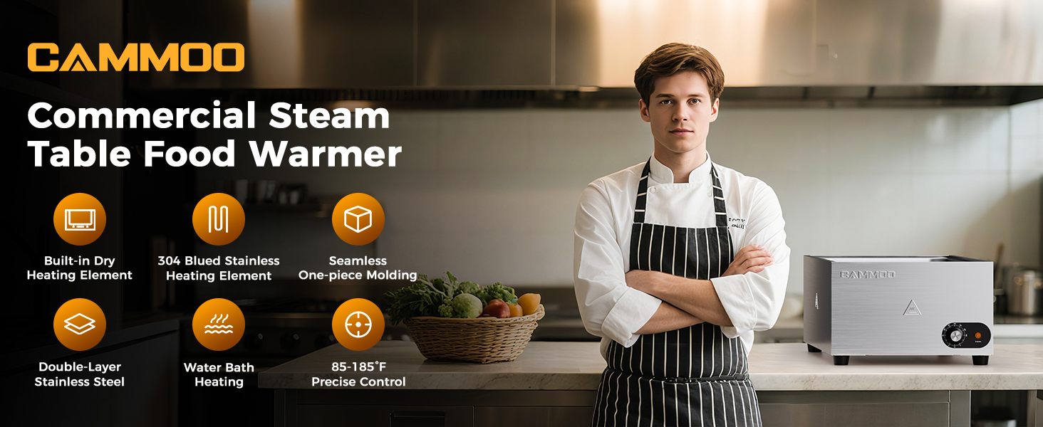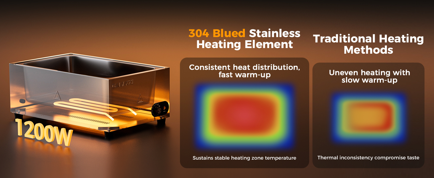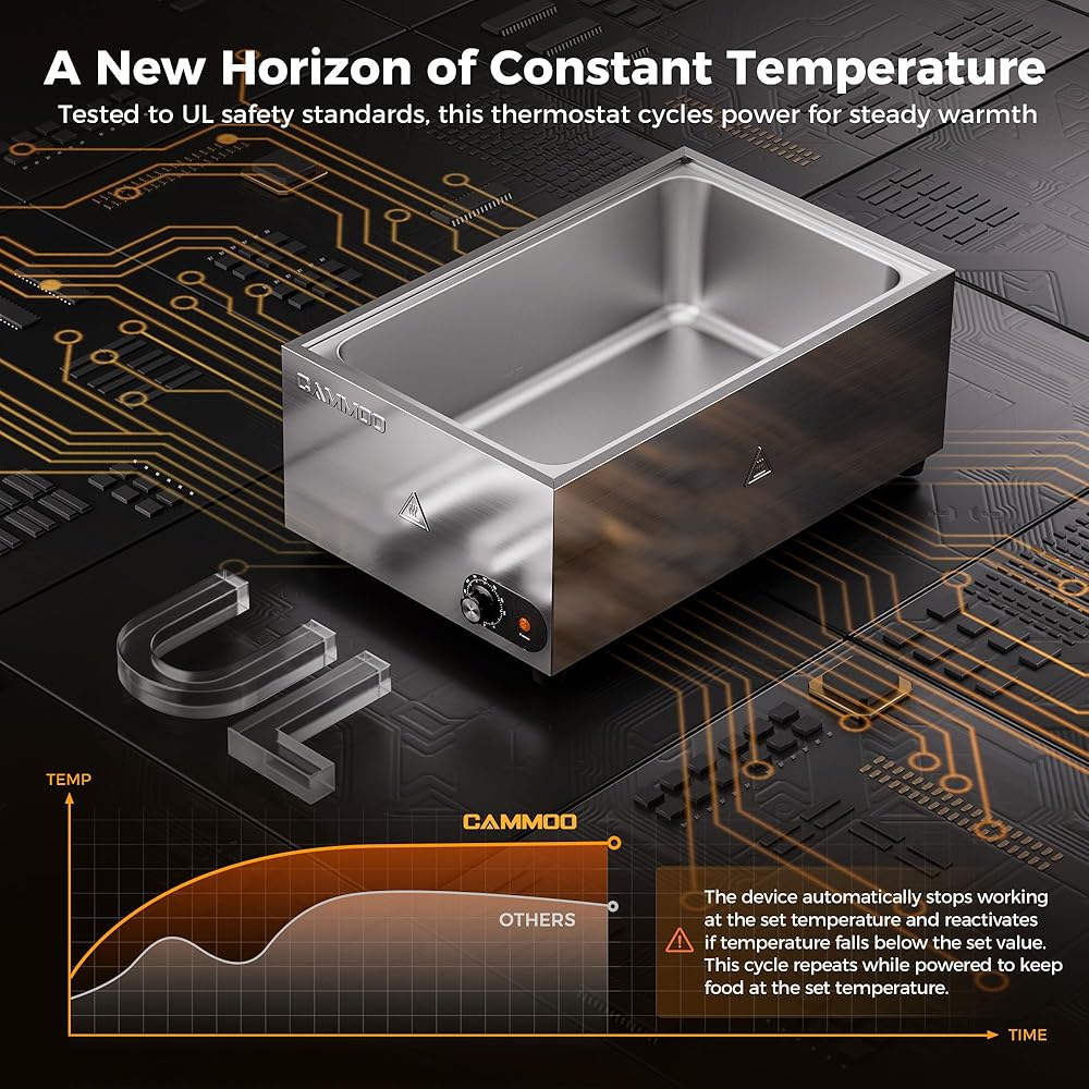 يتوافق منظم الحرارة الخاص بنا مع متطلبات السلامة UL، حيث يحافظ على درجة الحرارة المحددة بدقة. مع عنصر تسخين من الفولاذ المقاوم للصدأ باللون الأزرق 304 وتدفئة لطيفة في حمام الماء، يحافظ هذا التصميم ثلاثي الطبقات على الطعام في درجة حرارة تقديم مثالية لفترة أطول بكثير، لذا فإن كل مغرفة مذاقها مطبوخ للتو - حتى في ذروة العشاء.
