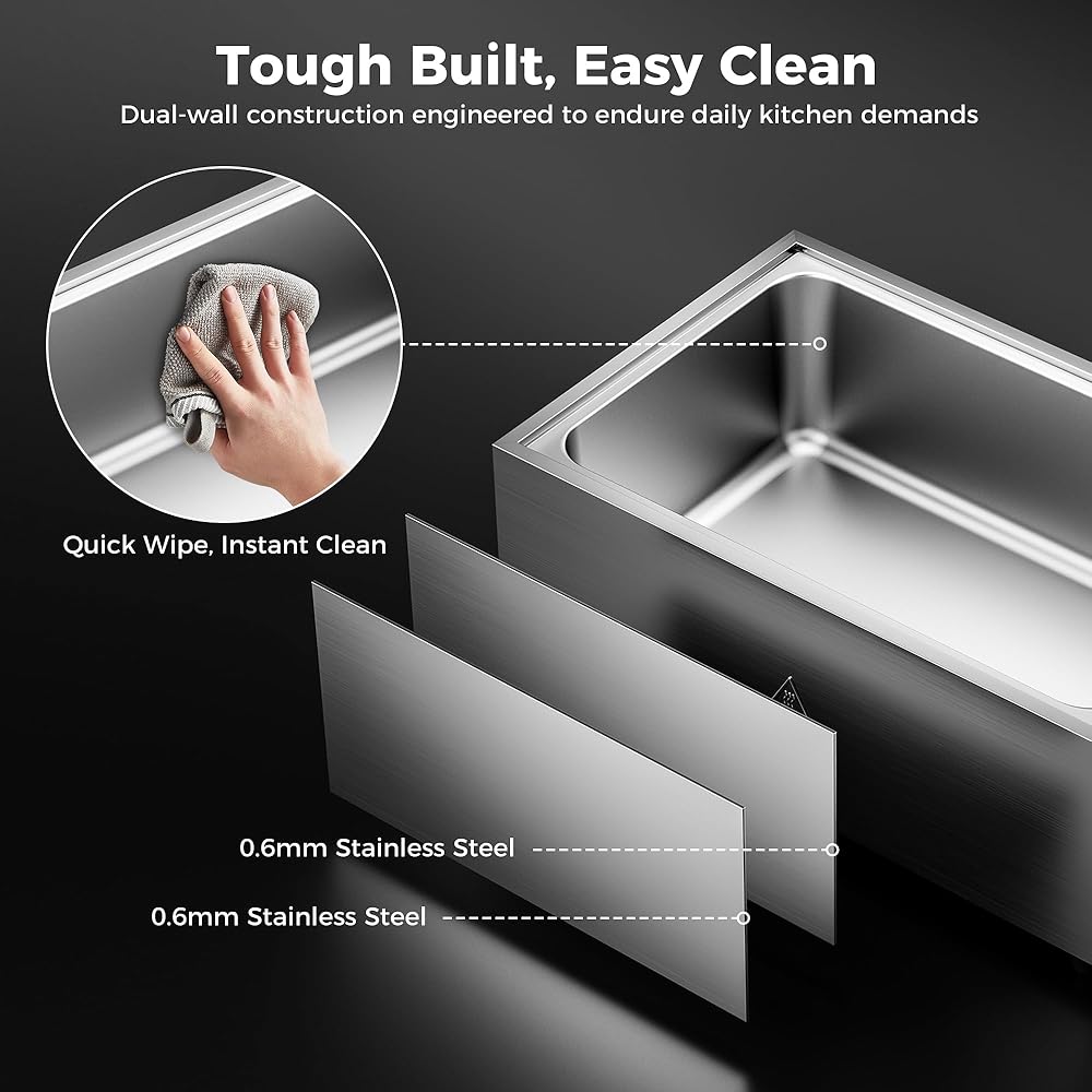 يعمل عنصر التسخين المخفي على التخلص من الزوايا التي يصعب تنظيفها، بينما يضمن الهيكل الفاخر ذو الطبقة المزدوجة المصنوع من الفولاذ المقاوم للصدأ أداءً مقاومًا للبقع. الشطف والمسح البسيط يستعيد مظهره الجديد تمامًا.