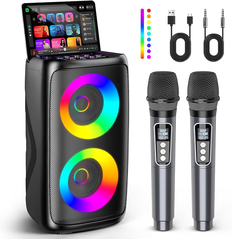 Karaoke Machine for Adults: Portable Bluetooth Speaker with 2 Wireless Karaoke Microphones with LED Lights Birthday Gifts for Party Family Home System Packages Support TWS/TF/USB/AUX