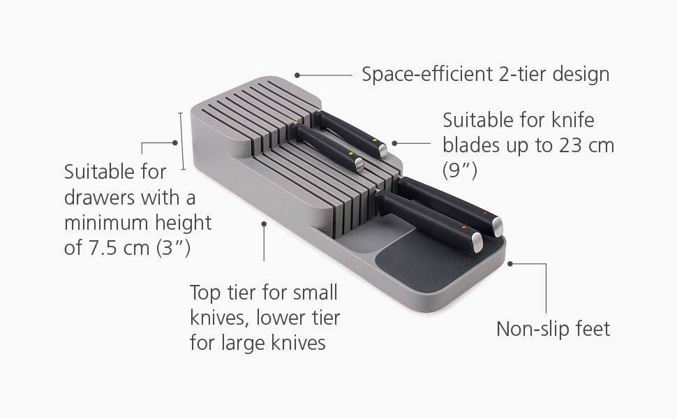- Suitable for knife blades up to 9 inches. Suitable for drawers with a minimum height of 3 inches